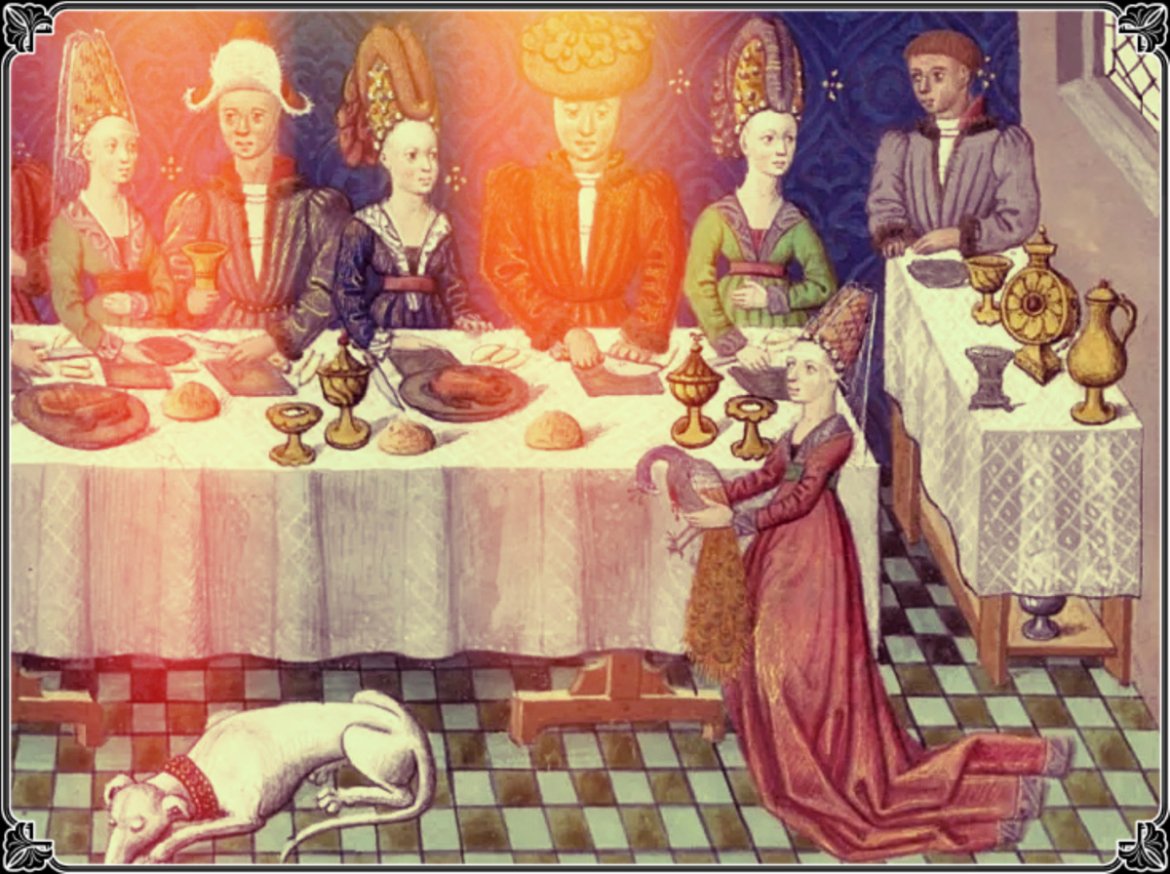 L’homme en rouge qui jusqu’ici dînait à part se leva. Il avait mis un masque de cuir qui couvrait le haut de son visage, laissant deux trous pour ses yeux. Debout, menaçant, il avait quitté sa cape qui découvrit ses gros bras musclés. Avec une étrange rapidité, il installa un billot de bois au centre de la salle et attendit. Il portait des gants rouges en cuir et dans sa main droite, une hache qui luisait aux lueurs des flambeaux.
