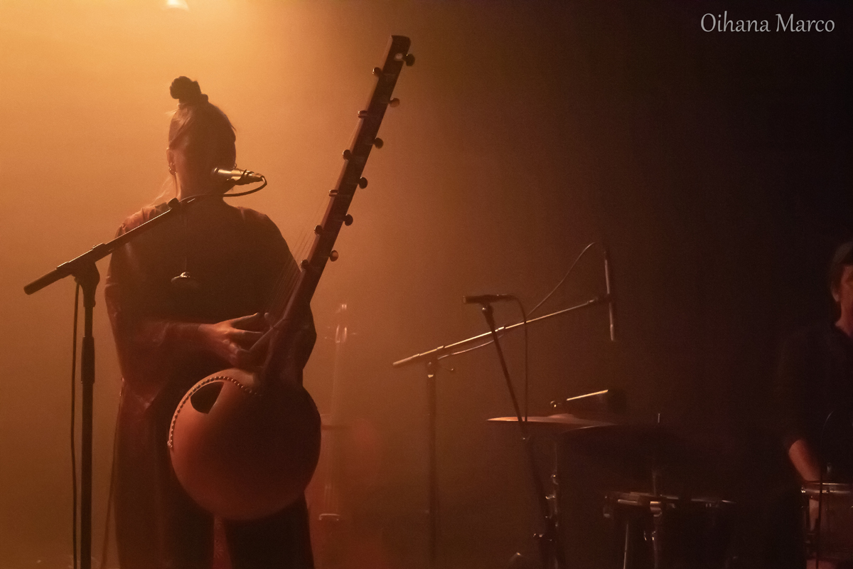 Lorsque Ona Mae entre en scène, c’est avec une sérénité magnétique. Quelques mots, puis un conte : celui d’un rêve, d’une femme enceinte d’où s’échappe la musique. De cette vision, raconte-t-elle, est née sa rencontre avec le kamélé n’goni, instrument traditionnel d’Afrique de l’Ouest, « l’art des jeunes chasseurs ».