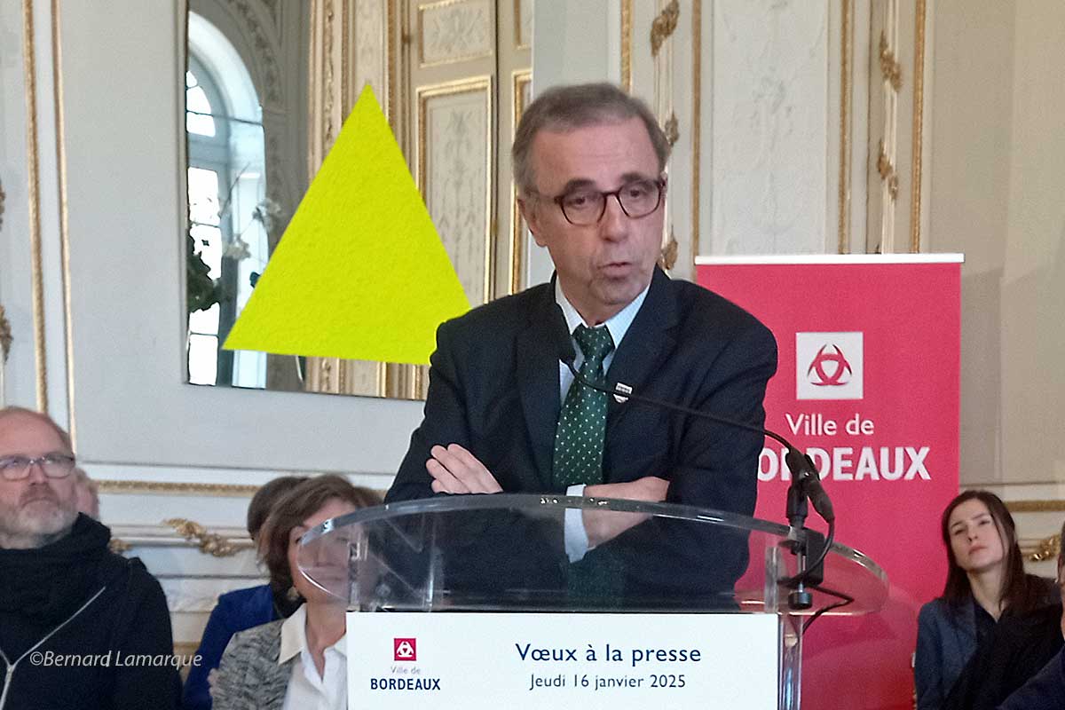 Il a fait état d’une profonde misère qui s’aggrave dans la ville ce qui l’a amené à parler de la Nuit de la Solidarité qui débutera le jeudi 23 janvier à 20 heures. A 18 heures lors d’un point presse à l’hôtel de ville, Pierre Hurmic maire de Bordeaux présentera le déroulé et les enjeux de la Nuit de la solidarité 2025 avant qu'elle ne débute. Le maire a aussi précisé que Bordeaux est une ville engagée avec 548 associations et que la ville lutte pour le droit des femmes et pour l'amélioration des quartiers comme celui de Marne Capucins qui regroupe 23 300 bordelais et la mairie s’attache à la prévention et l’étude en profondeur des différents quartiers. Il a aussi mentionné les travaux de Lescure avec les aménagements futurs des ombrières en panneaux photovoltaïques, ainsi que l’installation de 22.000 m² sur la Base Sous-Marine faisant de Bordeaux une ville solaire. Elle deviendra d’ici la fin de l’année, la plus grande centrale solaire urbaine de la ville. Il a avançait l’idée d’ombrières photovoltaïques sur le pont Simone Veil pour permettre de réduire la chaleur sur le pont en été tout en générant de l’énergie renouvelable. Il a aussi cité les travaux du Musée d’Aquitaine qui devraient se terminer en Mai. Il a fait état des temps forts qui vont se dérouler dans l’année. Il a envisagé la sécurité en indiquant le renforcement de la police municipale. On a eu droit à une forme de catalogue à la Prévert ouvrant de multiples pistes ne serait-ce que sur le sport bordelais qui a brillé en 2024 avec les Boxers vice-champion de France de Hockey comme l’UBB en rugby ainsi que les Lionnes qui elles ont renouvelé leur bail de championnes de France de Rugby Féminin. Il a eu aussi une intervention en faveur des journalistes dont il considère que le travail est essentiel avec la possibilité de rapporter des faits exacts et il a même fait allusion à la devise du Canard Enchaîné qui se formule comme suit : La liberté de la presse ne s’use que si ’on ne s’en sert pas. Une manière détournée de s’en prendre aux réseaux sociaux. Il a aussi précisé que 2025 serait une année clé pour le climat. Après l’élection de Trump , on peut se demander dans quel sens. Dans la rubrique des questions qui fâchent, il n’a pas abandonné le combat contre le GPSO en faisant allusion au projet de Notre Dame des Landes qui avait été abandonné après force contestations.