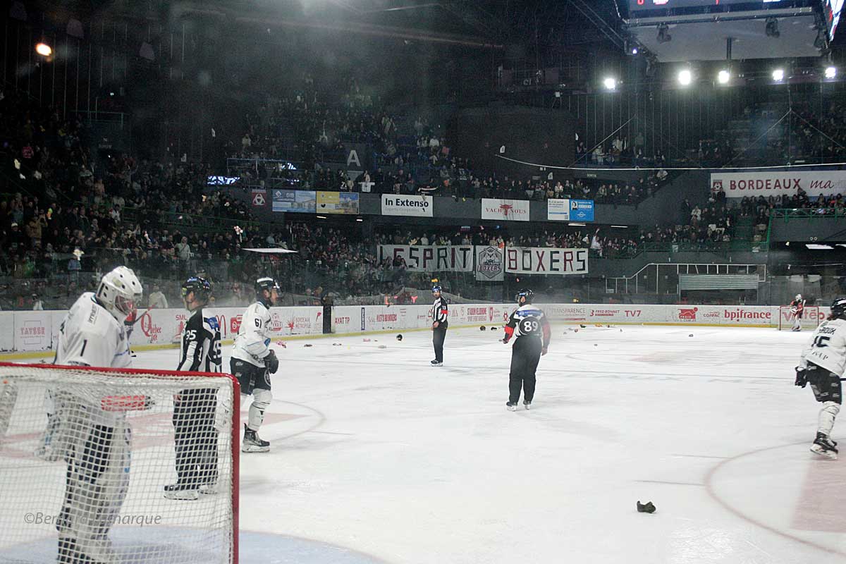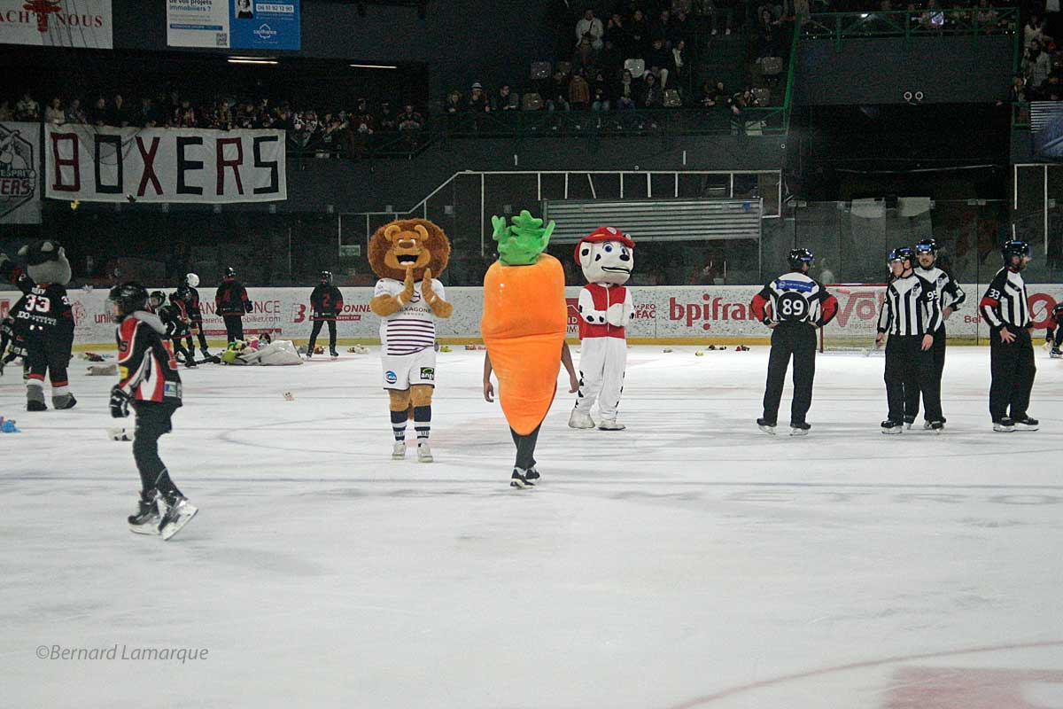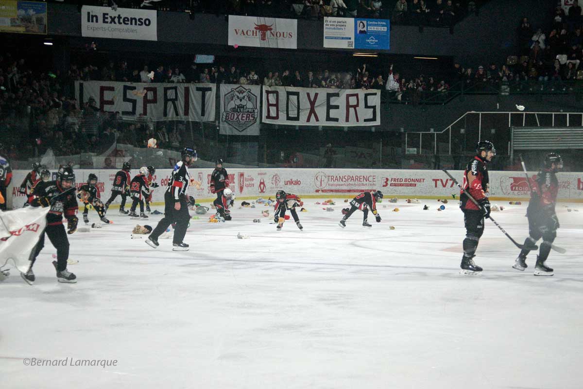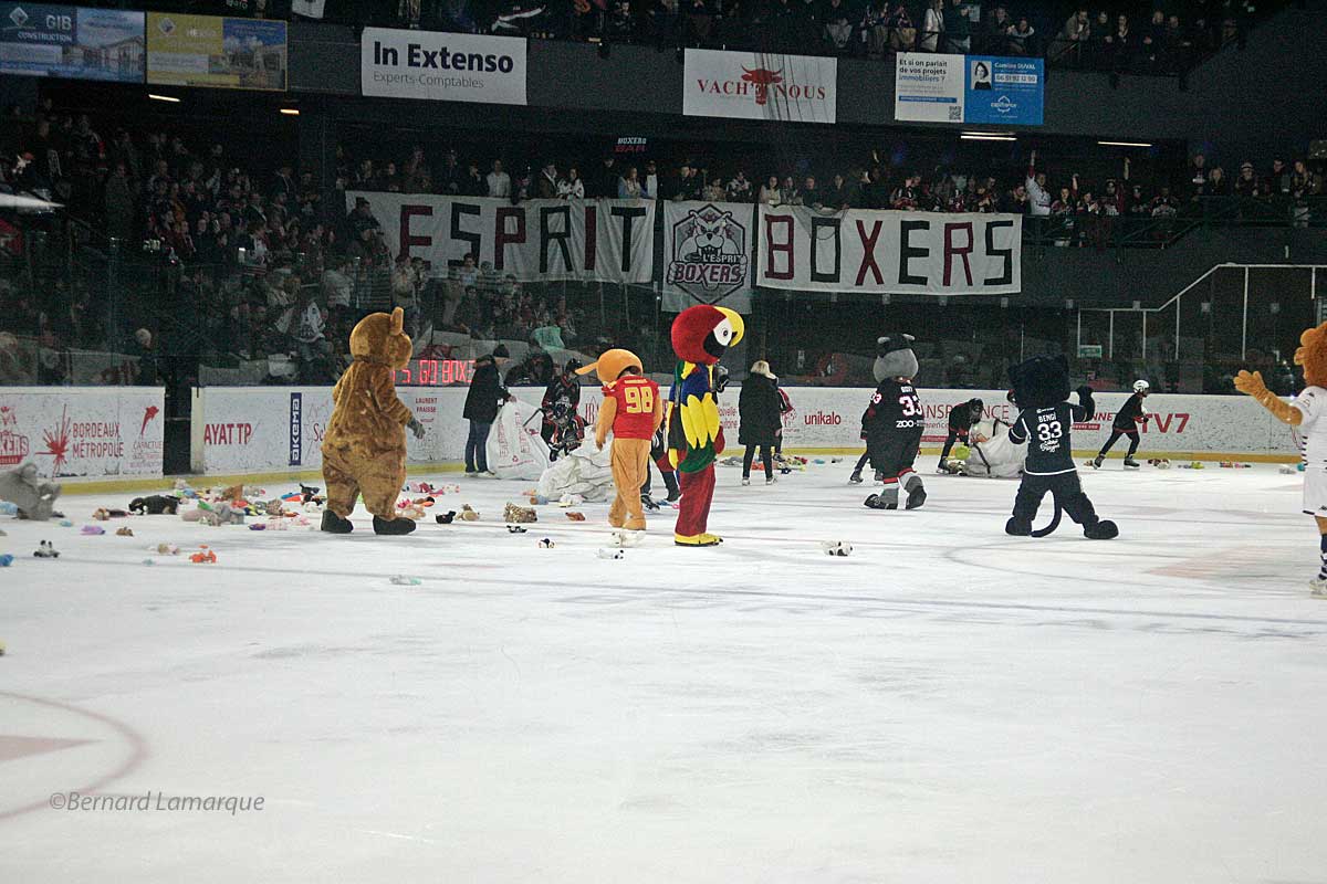 C’est au premier but marqué par les Boxers face à leur adversaire du soir que se déclenche l’envoi de peluches sur la glace entrainant le gel de la partie pendant que les enfants filles et garçons du club participent à la récupération des peluches envoyées sur la glace pour les remettre aux blouses roses. Créée en 1944, l’association accompagne enfants et parents lors des hospitalisations dans différents établissements bordelais.