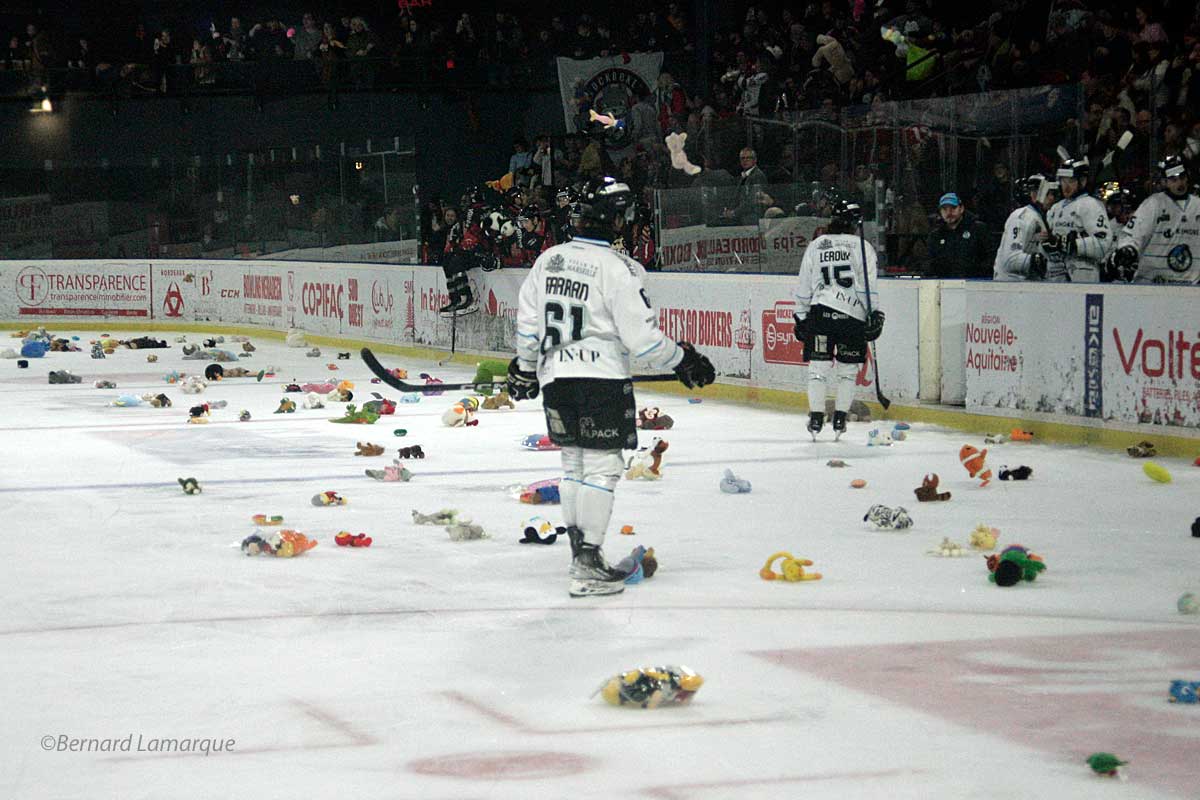 Le traditionnel match des peluches s’est déroulé à Mériadeck ce vendredi, pour la 35ème journée de Synerglace Ligue Magnus face aux Spartiates de Marseille. Ce concept importé des Etats-Unis, le « Teddy Bear Toss » , ou Opération Peluches, est devenu une tradition à Mériadeck depuis près de 10 ans et ce sont les Blouses Roses qui en sont les bénéficiaires pour les enfants hospitalisés.