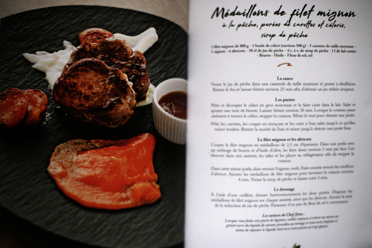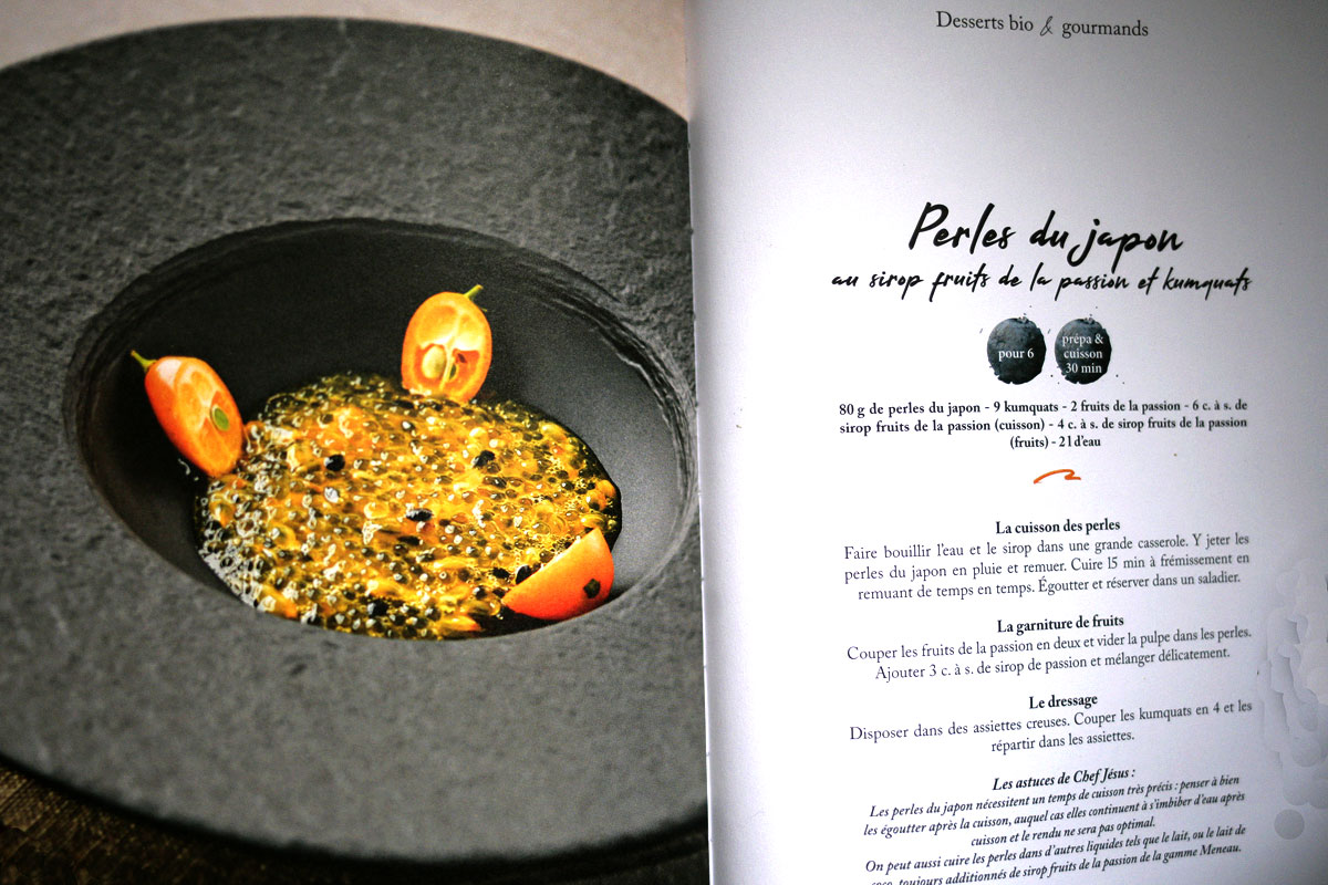 Bien sur la fin de l’opus est consacré aux desserts et lors de la présentation du livre pour les 140 ans de la maison Meneau, Chef Jésus a fait déguster "le Riz au lait aux amandes et au sirop d’orgeat" préparé en verrine individuelle et qui a beaucoup plu aux invités durant l’après midi, mais il n’y a pas eu que cela à déguster tout au long de la soirée. On trouve ainsi dans ce chapitre deux desserts dont l’intitulé rend hommage à la maison Neneau, ce sont les "Poires au vin de Noël de la Maison Meneau" et le "Tira’Meneau". La poire au vin est le dessert phare de Noël et souvent quand on les sert dans le courant de l’année certains n’hésitent pas d’y aller de leur "Tiens, c’est Noël !". En attendant vous pouvez mettre Noël dans votre assiette avec ce petit livre de recettes de cuisine bio & gourmandes mais pas que, car le côté soleil est délicieusement servi avec les intitulés de ces recettes que vous pouvez acquérir pour le faible coût de treize euros.