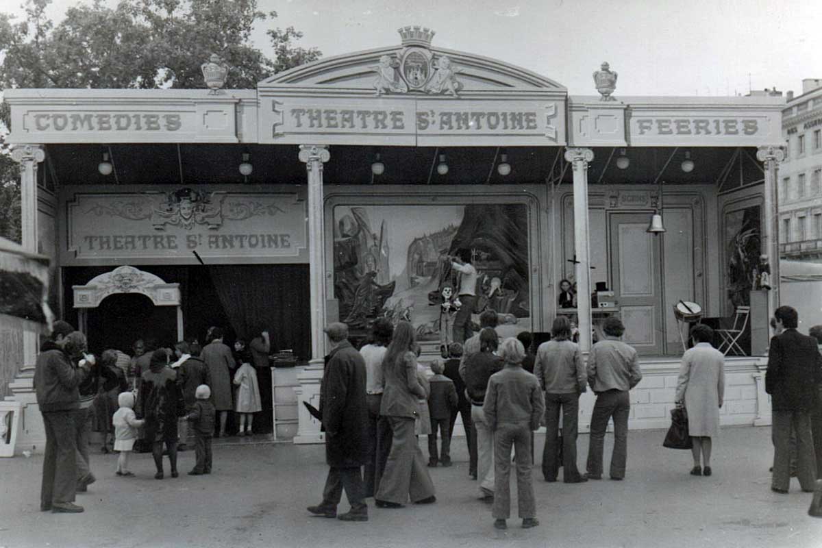 En 1858, pour la première fois, il est monté sur la place des Quinconces, côté Allées de Chartres. Etienne Guérin annonçait le spectacle et sonnait la grosse cloche. Plusieurs théâtres Saint-Antoine vont se créer en France vers la fin du XIXème siècle et nombre d’écrivains les fréquentent : Flaubert, Guy de Maupassant, George Sand. Au début de sa création, le Théâtre Saint Antoine présente des pièces théologiques : La Résurrection de Jésus-Christ en cinq tableaux, la Tentation de Saint-Antoine, suivies de projections de lanterne magique, de peintures sur verre. En 1894, le spectacle du Théâtre Saint Antoine s’enrichit de fantoches anglais, puis se termine par la Passion. Elle fut plus tard supprimée pour ne garder que la Tentation de Saint-Antoine.