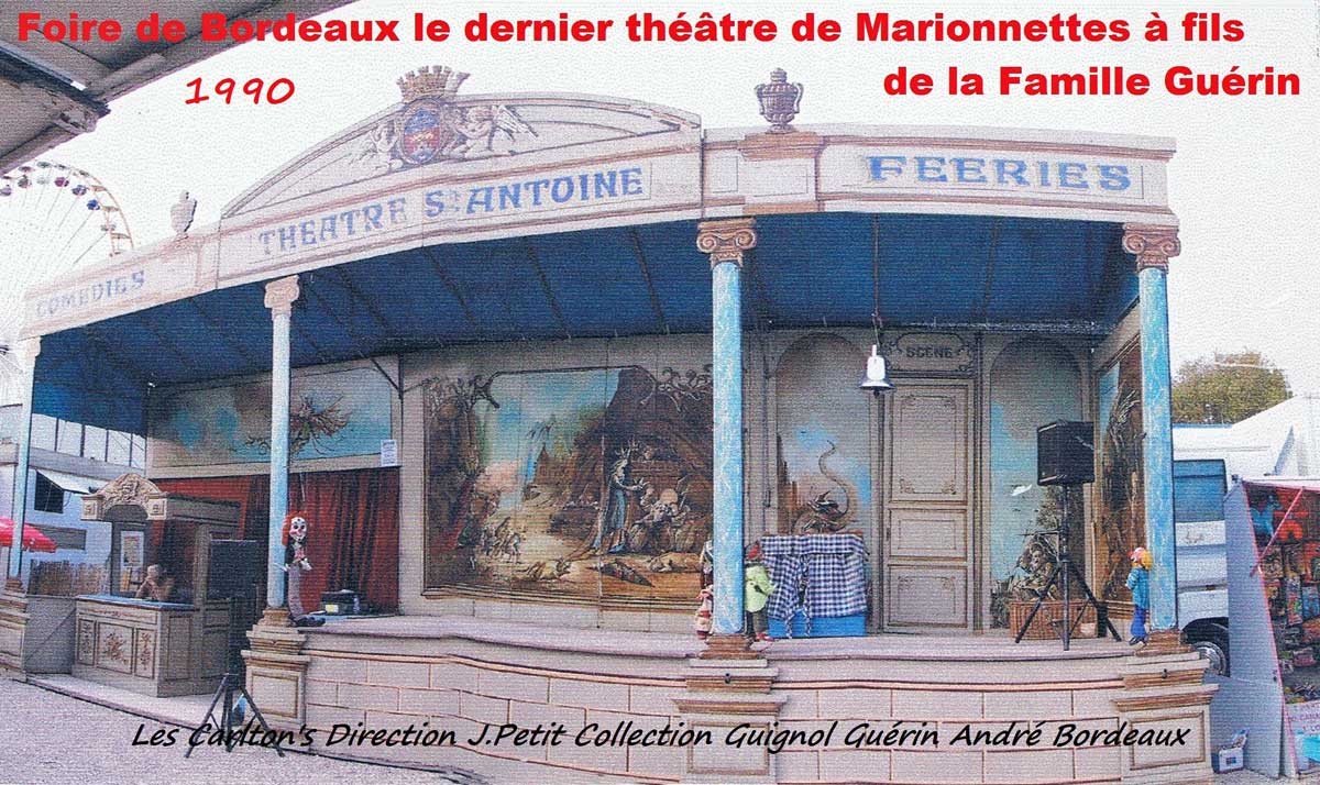 Depuis 1840 dans le droit fil de son grand frère lyonnais et de la Commedia dell’arte, la famille Guerin de pères en fils à travers Guignol et le Théâtre Saint Antoine a été à Bordeaux l’indispensable pilier de ces traditions, lesquelles ont peuplé et souhaitons-le pour de longues années encore, les rêves des jeunes de notre région, qu’ils soient espiègles, bavards, intimidés et même parfois légèrement effrayés en présence des marionnettes. Le Théâtre Saint Antoine a été fondé en 1858. Sa façade décorée de trois toiles peintes à la main s’étirait sur 25 mètres. Un deuxième théâtre remplaça le premier, devenu vétuste. Tastet décorateur du Grand-Théâtre peignit avec l’autorisation de la mairie les toiles qui représentent la tentation de Saint-Antoine. On pénétrait dans ce théâtre par deux portes situées de chaque côté. A droite du théâtre, un limonaire enchainait les éternelles rengaines populaires.