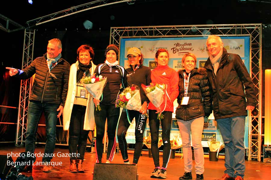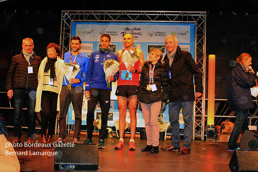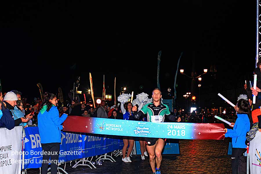 Le premier marathonien fut Vivien Laporte, sans surprise avec un chrono de 2h32’29’’. 6 minutes plus tard Christophe Noclain-Argouet franchi à son tour le portique d’arrivée, 2h38’51’’ pour lui. A 22h46, Sébastien Isnard termine sa course en 2h42’46’’. Il faudra attendre 15 minutes supplémentaires pour voir la première femme du marathon arriver sur la place de la Bourse. Elle se prénomme Rebeca Ruiz-Diez et affiche un chrono de 2h58’19’’. Blandine L’Hirondel arrache la deuxième place du classement féminin en 2h59’43’’ devant Maria Carmen en 3h15’17’’.
