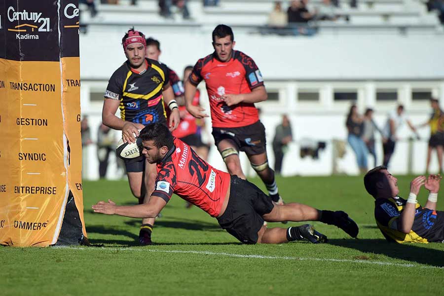 Une entame parfaite et un réalisme impitoyable auront eu raison des vaillants girondins bien trop diminués par de nombreuses absences sur blessures. A peine cinq minutes de jeu et le planchôt affiche déjà 10/0 pour des rouennais au jeu complet et puissant. Les poudriers ne se laissent pas abattre pour autant et grâce à son paquet d’avants donne du fil à retordre aux maritimes du bord de seine. Une première réduction du score sur pénalité redonne des couleurs aux jaunes et noir et après un déboulé de Mosese Mawalu sur son aile droite c’est Karim Abbad qui file entre les perches (8/10 13ème) pour relancer la partie. Loin d’être déstabilisés les Rouennais reprennent le jeu en main et trouvent la faille en pointant leur second essai du jour par leur ailier droit (17/8 25ème) et ajoutent une pénalité (35ème) pour virer à la pause avec douze points d’avance. (20/8)