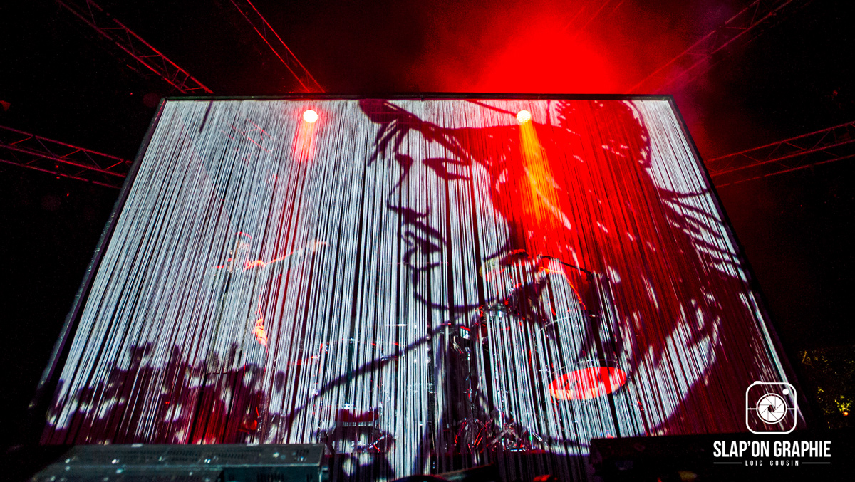 Avant la grosse sensation de la soirée, tous les regards et les oreilles se sont tournés vers la petite scène avec le hip-hop Cabadzi X Blier. Derrière un rideau de fil pendant les 2 premières chansons, Olivier Garnier (chant) et Victorien Bitaudeau (batterie) n’ont dévoilé leurs visages qu’à la troisième chanson. Avant l’ouverture du rideau, nous avons découvert une animation visuelle sur les fils présentant les titres interprétés par les 2 artistes comme « Bouche », « Oui », « Polaroïd ». Un heure de concert plus tard, les 12 000 festivaliers se dirigent vers la scène principale.