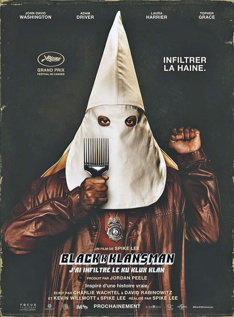 Synopsis : Au début des années 70, au plus fort de la lutte pour les droits civiques, plusieurs émeutes raciales éclatent dans les grandes villes des États-Unis. Ron Stallworth devient le premier officier Noir américain du Colorado Springs Police Department, mais son arrivée est accueillie avec scepticisme, voire avec une franche hostilité, par les agents les moins gradés du commissariat. Prenant son courage à deux mains, Stallworth va tenter de faire bouger les lignes et, peut-être, de laisser une trace dans l’histoire. Il se fixe alors une mission des plus périlleuses : infiltrer le Ku Klux Klan pour en dénoncer les exactions. En se faisant passer pour un extrémiste, Stallworth contacte le groupuscule : il ne tarde pas à se voir convier d’en intégrer la garde rapprochée. Il entretient même un rapport privilégié avec le "Grand Wizard" du Klan, David Duke, enchanté par l’engagement de Ron en faveur d’une Amérique blanche. Tandis que l’enquête progresse et devient de plus en plus complexe, Flip Zimmerman, collègue de Stallworth, se fait passer pour Ron lors des rendez-vous avec les membres du groupe suprémaciste et apprend ainsi qu’une opération meurtrière se prépare. Ensemble, Stallworth et Zimmerman font équipe pour neutraliser le Klan dont le véritable objectif est d’aseptiser son discours ultra-violent pour séduire ainsi le plus grand nombre.