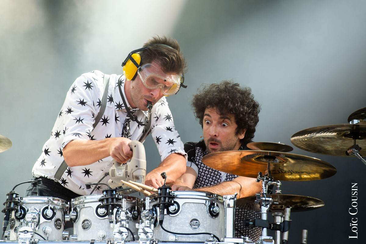 Du soleil et des festivaliers qui dansent, il fallait dans la foulée se rendre sur la scène 2 pour retrouver les landais de Mont-De-Marsan, du groupe « les Hurlements de Léo » qui encore une fois, fidèles à eux-même ont offert, tout en explosivité et énergie, un concert fou. Laurent Kebous leader du groupe accompagné de Julien Arthus sont venus présenter un nouvel album, le septième « Luna de Papel » . Un groupe avec guitare, saxophone, violon, trompette, batterie, accordéon, mélange parfait pour une musique festive et folklorique. Le coup de coeur Bordeaux Gazette de cette soirée se passe sur la grande scène avec les « Fills Monkey » . Prenez 2 batteries, 2 musiciens de talent Sébastien Rambaud et de Yann Coste, et ajouter un spectacle musical/humoristique/performer et vous obtiendrez le parfait combo du concert qui a donné lieu à l’ovation du public. Les deux compères qui au début font office de rivaux, deviennent tout au long du concert des partenaires de jeux qui ont offert un show DEMENTIEL. Une batterie circulaire aux sons multiples (dont des bruits d’animaux, si, si !!!) a donné une touche de performance supplémentaire reprenant du AC/DC, Deep Purple, et même la musique du jeu Tetris.