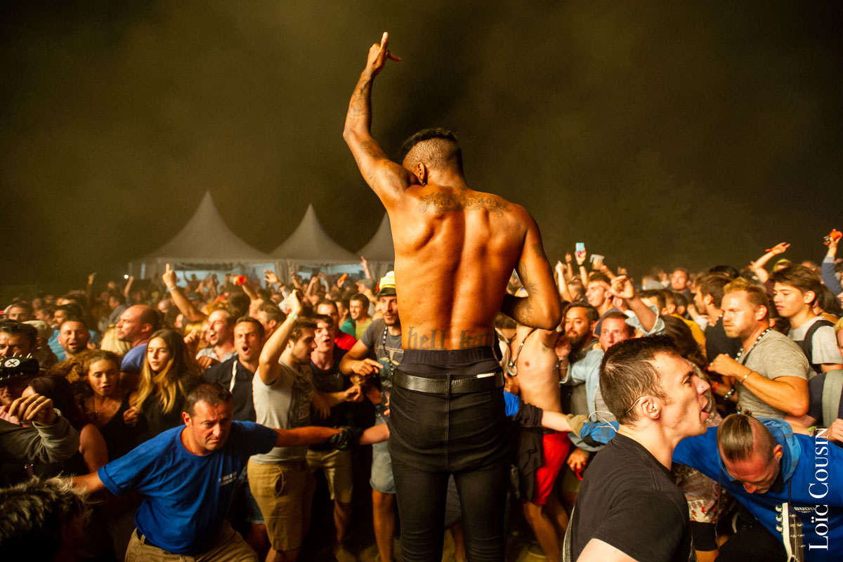 En effet, si on sait que le concert de Mat Bastard, est un électrique mélange de Rock sur scène, de jeux avec le public, de provocation où les festivaliers ont comme d’habitude répondu présents, les agents de sécurité ont du jongler entre les barrières mises à rude épreuve et des festivaliers pour certains très jeunes qui ont dû être sortis de la fosse pour éviter de se faire piétiner. 2 d’entre eux ont d’ailleurs été invité à venir danser et sauter sur scène avec le leader Mat. « Stand as one », tube de Mat Bastard que l’on entend notamment sur RTL 2, a fait lever les bras de tout un peuple, ou encore la famille comme l’appelle le chanteur. Sur la dernière chanson, dédiée à Marine Le Pen, et reprise du groupe « Berurier Noir », « Porcherie », Mat Bastard est descendu au milieu du public, avec ses musiciens, et instruments pour une vraie folie à la Pommeraye. Tête d’affiche de cette 2ème soirée, la grande scène était en mode All-Star, avec le groupe le plus demandé en festival depuis 2006 (plus de 90 représentations), Shaka Ponk venu présenter le show 2018. Frah et Sam, chanteurs du groupe, fidèles à eux mêmes ont fait soulever le public et les jardins d’Anjou, en allant plusieurs fois dans le public, en slamant, et en allant taper dans les mains et embrassant les fans du premier rang à la fin du concert.
