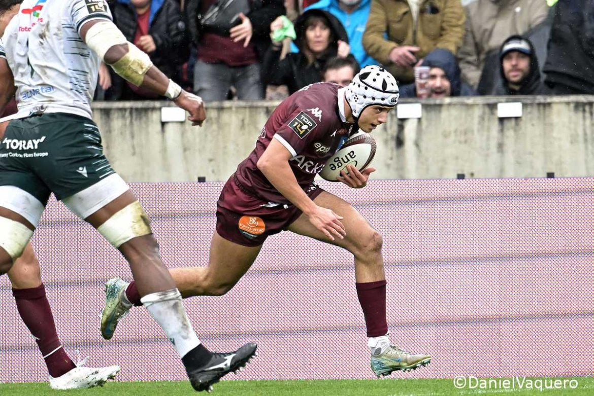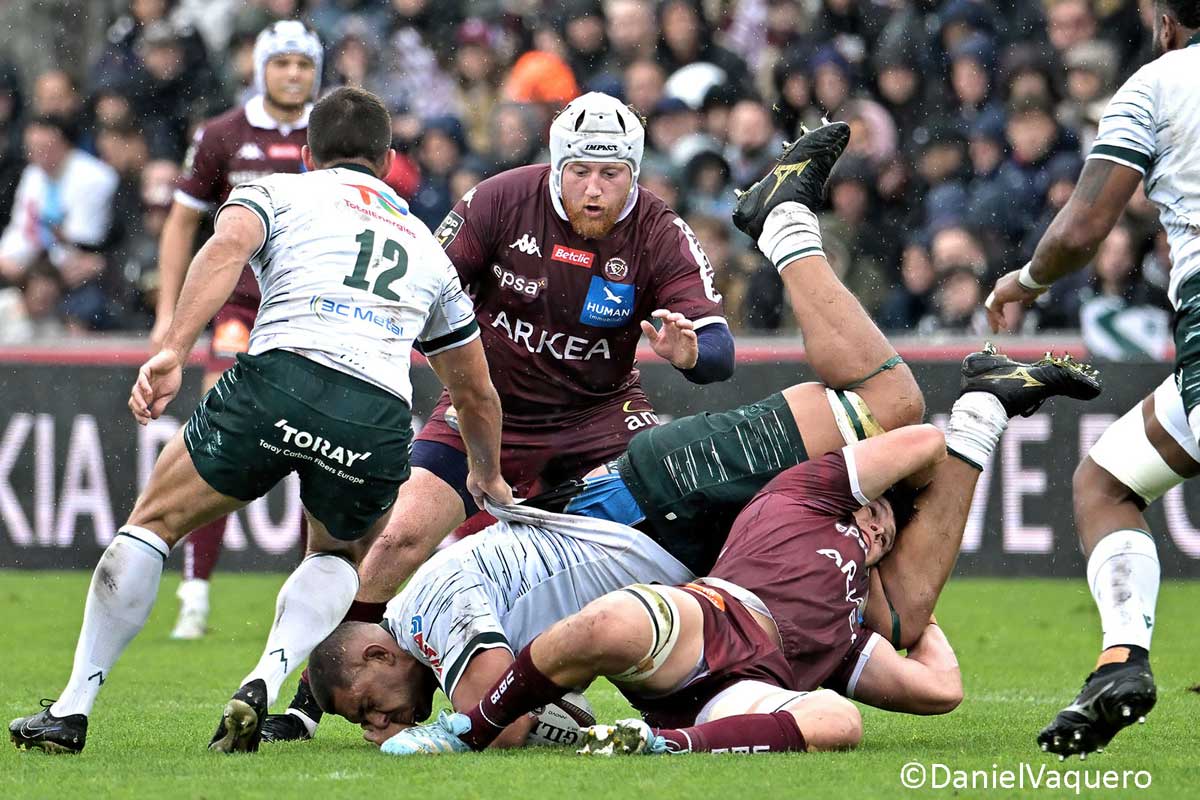 Sous cette pluie régulière pas forcément violente mais terriblement gênante, le jeu au pied a été très important durant cette partie parfois pas très enthousiasmante. Dans cette grisaille on a assisté à la cinquante et unième minute à une belle intervention de Jalibert arrivé à toutes jambes pour faire bénéficier d’un magnifique service Bielle-Biarrey pour aller marquer comme dans un fauteuil. Il est évident que la longueur du jeu au pied de Lucu sur les sorties de camp comme celui de Jalibert dans le jeu ouvert a tenu les palois loin des lignes des locaux leur rendant toutes velléités d’attaques difficiles. Ceci s’est traduit à l’affichage par un maigre score de six points pour les visiteurs en fin de rencontre. Il faut constater que le dézonage pratiquement systématique des ailiers avec en plus les montées saignantes de Buros créent une grande incertitude dans la défense adverse permet aux bordelo-béglais de scorer même dans des conditions difficiles comme les 32 515 présents ont pu le constater. Malgré tout, le problème de la touche subsiste car on n’arrive pas à retrouver une rampe de lancement correcte depuis les saisons passées. Il faut constater que sur ce match, autant Lucu que Jalibert ont montré une forme internationale et cela risque de poser des problèmes de choix à Galthié pour cette fenêtre internationale de l’Automne.