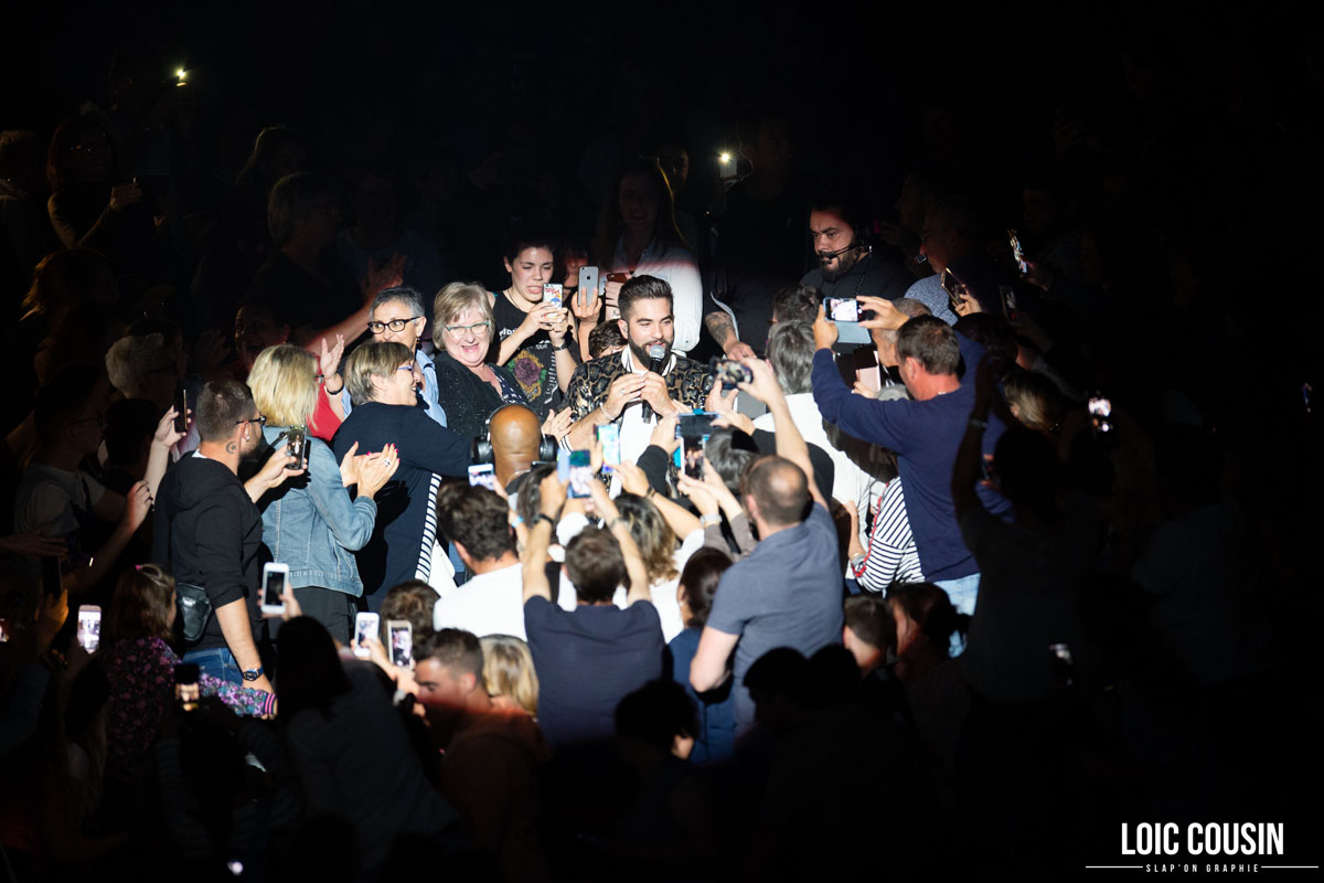 Comme pour les remercier et montrer sa reconnaissance d’être fidèles au rendez-vous, l’artiste commence son concert en arrivant depuis les tribunes du deuxième étage. Il traverse la salle de gauche à droite puis fait la même chose à l’étage en dessous avant de traverser la fosse pour rejoindre ses 6 musiciens et commencer le show. Avec 2 batteries, 2 guitares aux sons latino, 1 basse, 1 clavier, Kendji assure un concert de 1 h 50, avec les morceaux qui font son succès, tels que « Color Gitano », « Bella », « Me quemo », « Andalouse » .