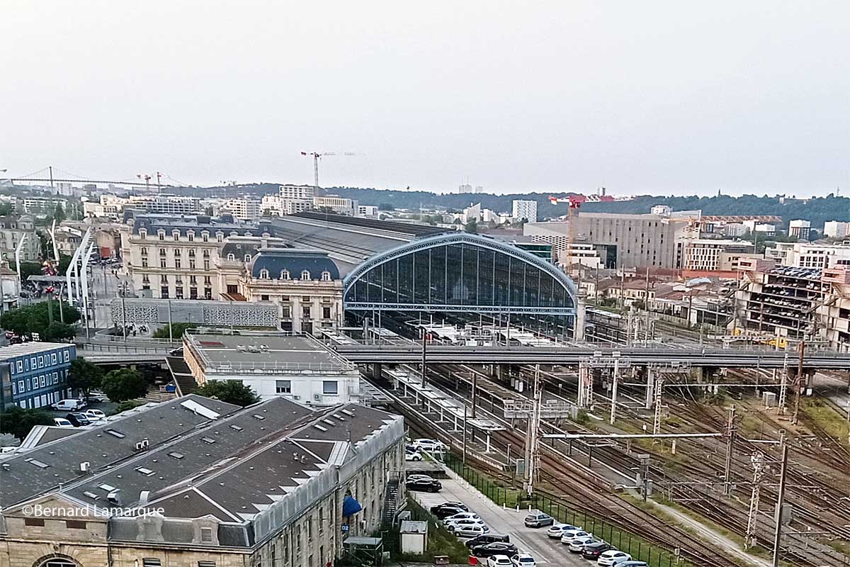- Vue sur la gare Saint Jean depuis le Rooftop du Jost, on peut apercevoir le pont d’Aquitaine au loin