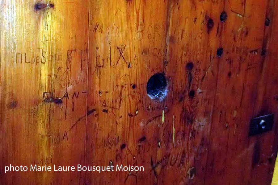 De robustes portes en bois aux verrous énormes percées d’un œilleton sont gravées de mots inachevés et de surnoms étranges soulignant le contraste entre la dureté de ce lieu et la volonté de ces prisonniers de ne pas se laisser déshumaniser.