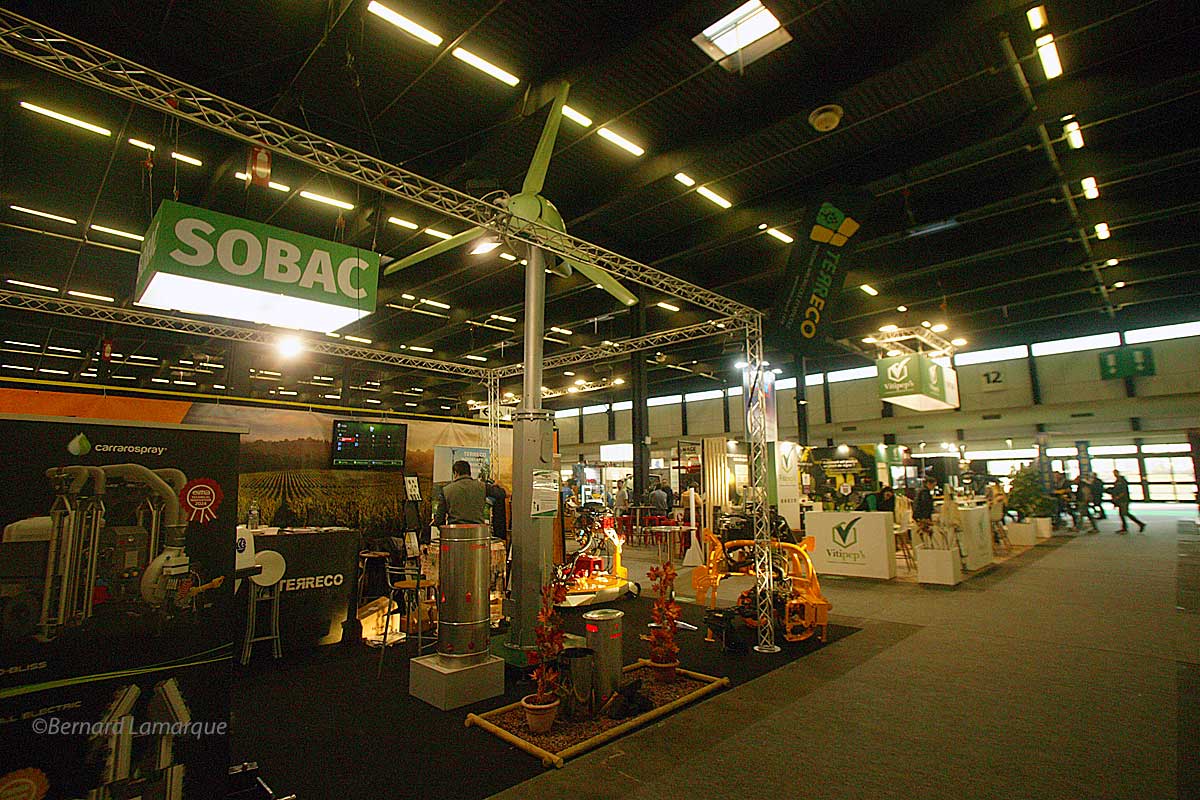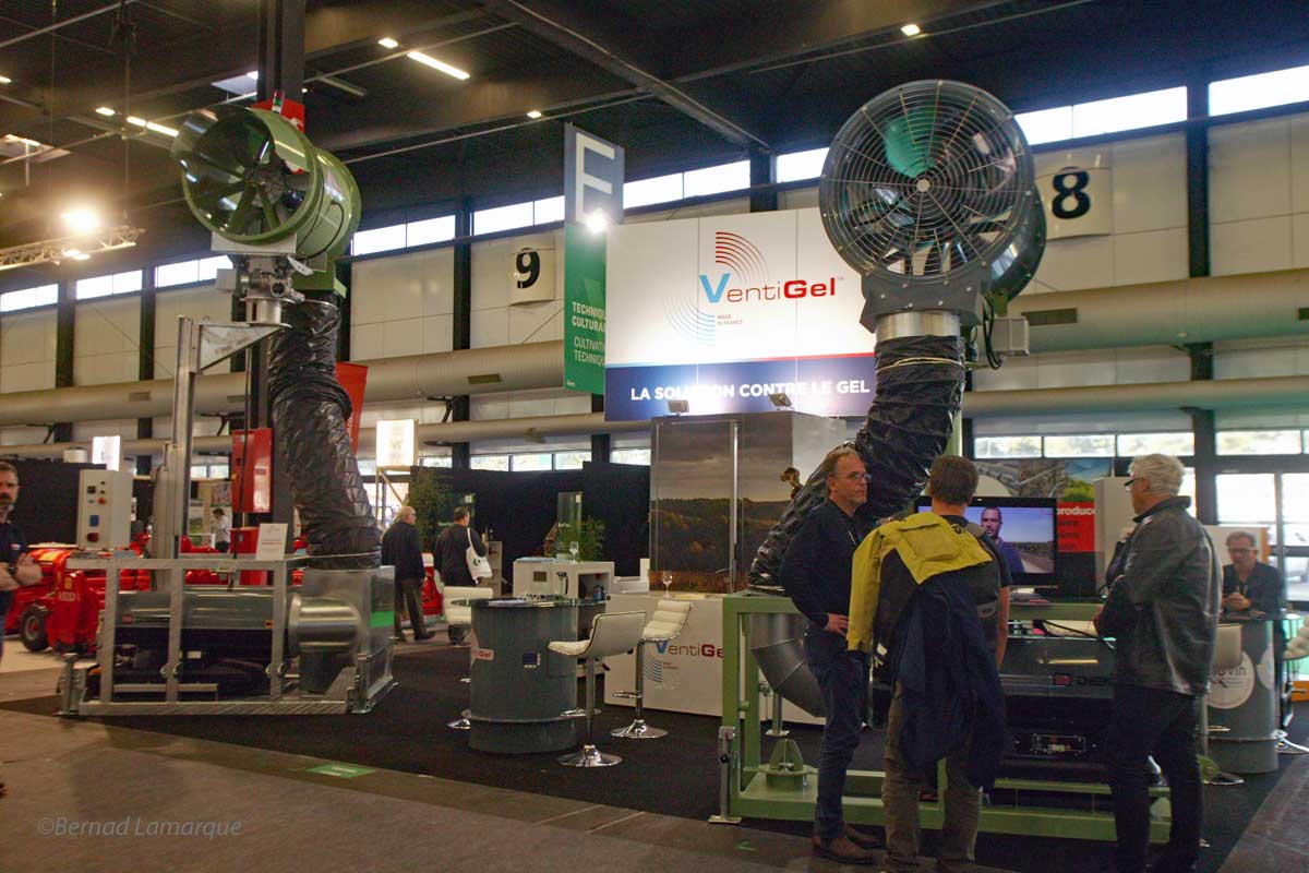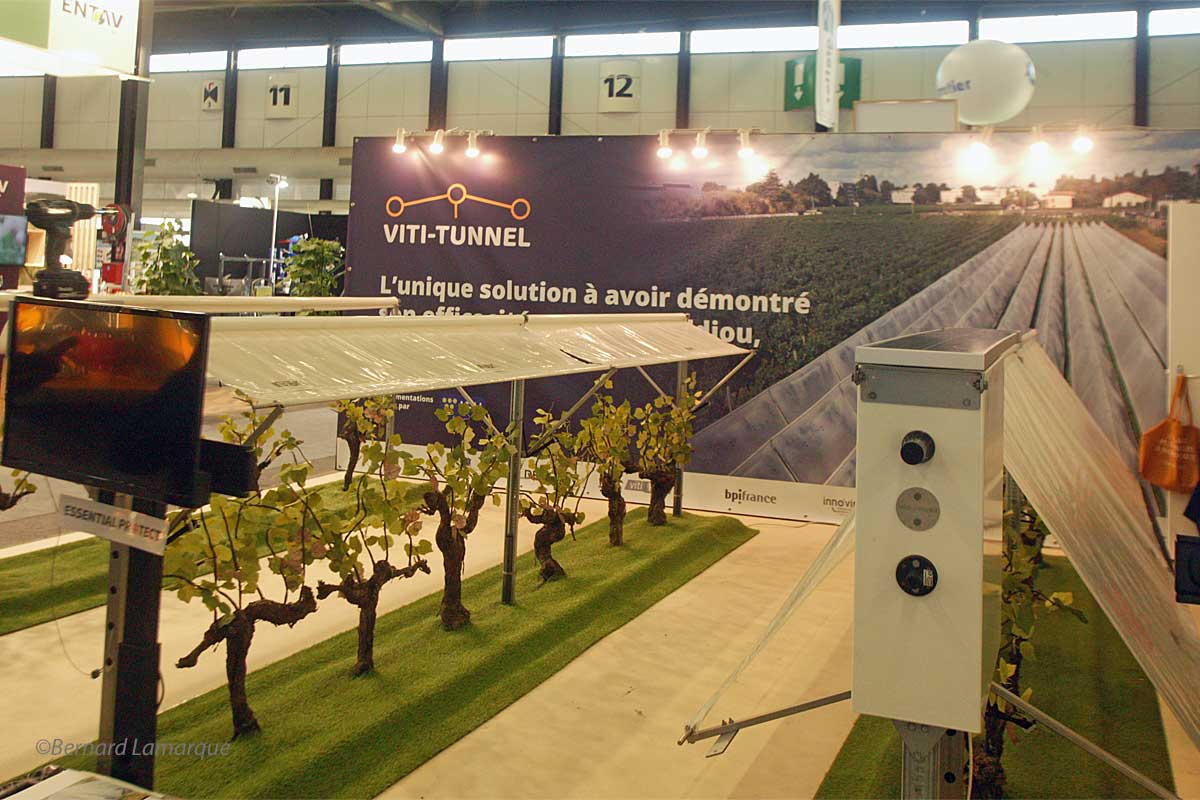 Pour la vigne l’idéal serait un système capable de répondre à la protection contre le gel mais aussi simultanément de répondre à des phénomènes tout aussi dérangeant que la pluie ou la grêle à côté du froid qui en général est souvent limité dans le temps sur des périodes assez bien connues des viticulteurs. Les voiles d’hivernage montrent, campagne après campagne, une bonne efficacité. Ils sont autorisés sauf dans les AOC dont le cahier des charges les interdit ce qui complique la situation dans le vignoble bordelais qui compte de nombreuses AOC, même si le système y est implanté. Ces viti-tunnel protègent non seulement les vignes des aléas climatiques (gel, forte pluie, grêle et forte chaleur), mais aussi de la maladie (mildiou, excoriose et black-rot). C’est du reste en Gironde que cette innovation a vu le jour mais bien difficile de l’utiliser dans les grands châteaux. De quelque côté que l’on se tourne on voit bien que quel que soit le type de culture le problème majeur si on veut préserver ses récoltes est d’ordre financier. Ce genre de salon permet d’ouvrir un œil sur le monde qui nous entoure et de voir ce que l’homme invente et réalise pour tenter de le domestiquer, mis tout compte fait il reste bien peu docile.