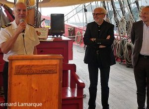 Lors du passage de l’Hermione à Bordeaux dans les jours qui ont précédé les 20 ans de Bordeaux Fête le Vin Olivier Pagesy et Norbert Fradin (...)