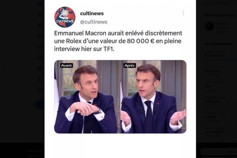Vu sur twitter les deux photos que l’on peut observer jumelées où visiblement Macron a dégrafé discrètement sa montre car effectivement 80 000 euros ça fait quelques mois de retraites pour un smicard. D’autant que durant cet interview où il a été particulièrement méprisant pour le français de base, il laisse apercevoir des signes extérieurs de richesse et avec 80 000 euros un éboueur retraité pourrait en faire des choses et lui payer quelques mois de loyers s’il n’est pas propriétaire, mais comment un éboueur peut-il être propriétaire à Paris. Il semble que les provocations orales de Manuel Macron ont porté leurs fruits car c’est surement ce qu’il cherchait à provoquer et résultat la porte de la mairie de Bordeaux a payé la note. A travers son discours il veut provoquer les manifestants afin qu’ils se discréditent à travers l’action des casseurs en leur mettant la note sur le dos. Il a déjà créé la crise des gilets jaunes et on se demande qu’est-ce qu’il va nous ramener comme nouvelle crise.