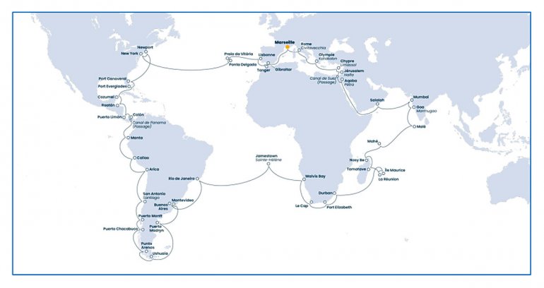 Le Costa Deliziosa a débuté son voyage inoubliable de 128 jours au tour du monde le 6 janvier de Trieste avant de rejoindre Marseille le 12 janvier prochain. 2 000 passagers de 40 nationalités différentes embarqueront pour cette croisière hors du commun. Seront présents majoritairement des Français qui représentent un quart des passagers, des Italiens et des Allemands (respectivement 360 et 340), des Suisses (environ 160), des Espagnols (environ 140) et d’Autrichiens (un peu moins de 100). Le voyageur le plus âgé est un Français de 94 ans, tandis que le plus jeune est autrichien, âgé de 6 ans. Le navire sera de retour en Italie le 13 mai 2023. La croisière la plus appréciée des amateurs de voyages de Costa est de retour pour cette nouvelle année avec un itinéraire d’exception. Costa a été parmi les premières compagnies à proposer ce voyage exceptionnel, depuis les années 1970. Pour information : tarif indicatif en cabine balcon avec vue sur la mer à partir de 15 000 € par personne. Il est possible de ne faire qu’un ou plusieurs segments de cette croisière.