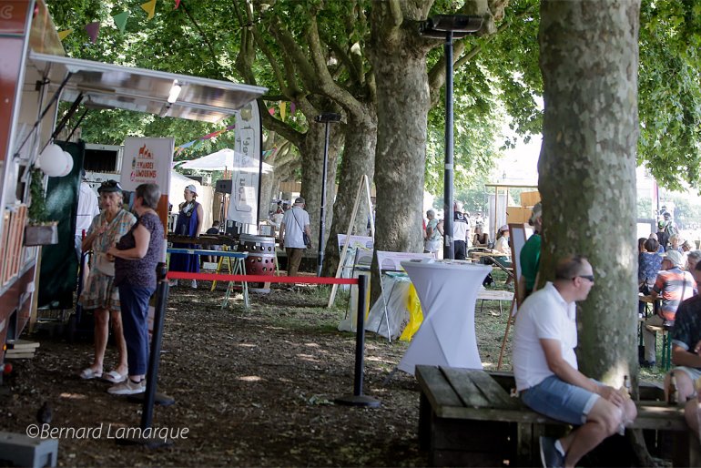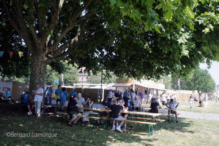 Il fait toujours aussi chaud sur ce Bordeaux Fête le vin 2025 et pour ceux qui sont sur place à midi, il est important de se mettre à l’ombre. La partie la plus ombragée de la fête est prise d’assaut pour le repas de midi quand on veut déjeuner sur place et même bien au delà ainsi que les petits ilots d’ombre générés par des plantations d’arbres isolés et éparses. Peu de verres de rouge en main à cet horaire ou le blanc et le rosé dominent la situation mais aussi le pétillant ainsi que la bouteille d’eau qu’elle soit plate ou gazeuse. C’est la recherche de l’ombre maximum car le béton et l’asphalte des quais assimilent la chaleur avant de la restituer et tout le monde est en tenue légère afin de résister à la chaleur. Seule les soirées quand le soleil a disparu permettent aux visiteurs de gouter des breuvages plus foncés. Les forces de secours si nécessaire sont présentes car il y a toujours des personnes qui se croient plus fortes que les autres en prenant des risques inconsidéré dans cette ambiance surchauffée ou la proximité de l’eau apporte peu de fraicheur dans ces conditions particulières de pic de chaleur. Pour l’instant l’organisation n’a pas a déplorer d’accident graves dans ce contexte. Dans ces conditions se sont les glaciers qui tirent leur épingle du jeu et ils ont un peu de peine à fournir tant la demande est énorme tout au long de la journée. Maintenant il ne reste plus qu’une journée pour consommer les derniers éléments du "pass dégustations" avant que la fête ne ferme ses portes en attendant l’année prochaine ou on espère un temps un peu plus clément car cette année la chaleur a été excessive.
