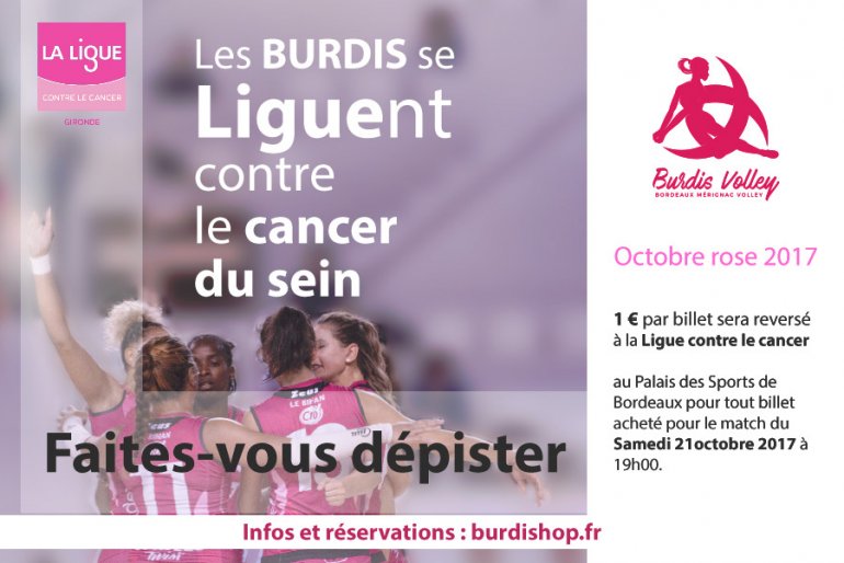 Les Burdis, à cette occasion, joueront le 21 octobre à 19h au Palais des Sports de Bordeaux, contre le club d’Halluin. Ce soir-là, à l’entrée du Palais des Sports, la Ligue Contre le Cancer et EOVI Mutuelle MCD, tiendront un stand avec des bracelets mis en vente. Ils seront de couleur rose pour les femmes et bleu pour le dépistage du cancer colorectal qui touche de plus en plus d’hommes. Une distribution de goodies dans le public se fera et la Dé Banda De, la banda de Sciences Po Bordeaux sera là, afin de mettre une ambiance de folie.
