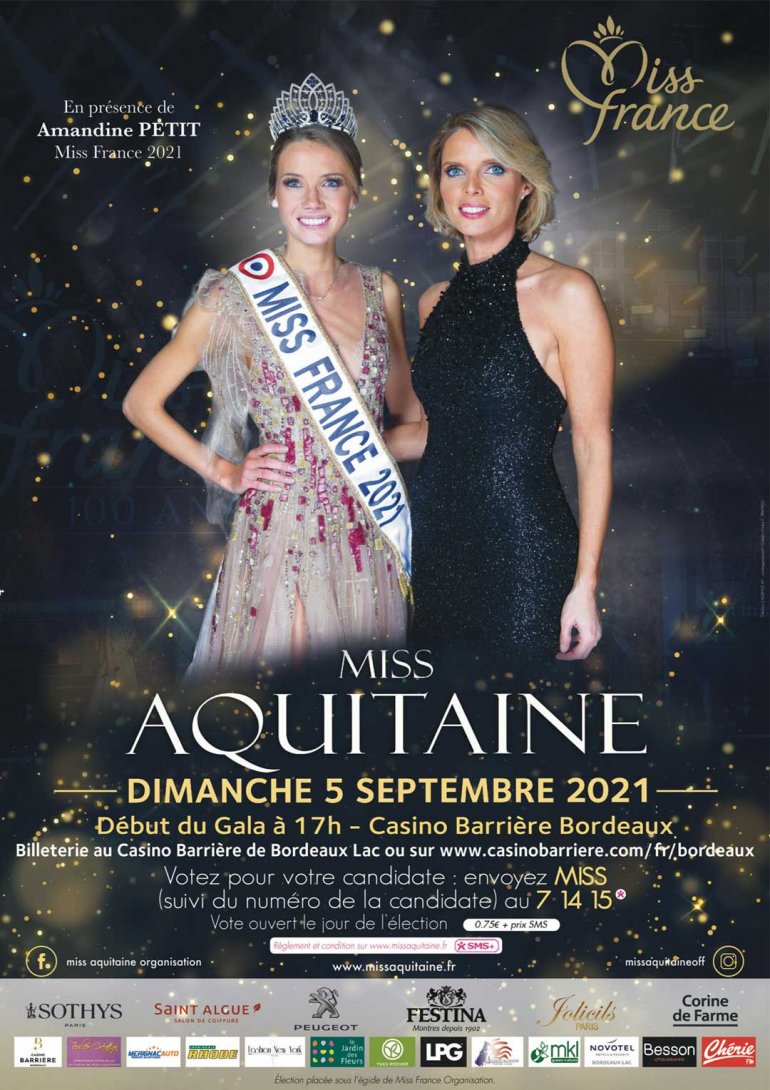 Le Casino Théâtre Barrière de Bordeaux accueillera l’élection de Miss Aquitaine 2021, le dimanche 5 Septembre prochain à 17h00. Seize candidates au titre de Miss Aquitaine 2021 représenteront fièrement leur région devant un jury composé de partenaires et d’Amandine PETIT, Miss France 2021 qui sera également présente. Au cours de cette élection, les seize prétendantes au titre de Miss Aquitaine 2021 tenteront de convaincre le jury en défilant en robe de soirée et en tenue balnéaire. Afin de mieux les connaître, chacune dévoilera sa personnalité et présentera ses motivations au micro devant les spectateurs. Les Miss Aquitaine, anciennement élues, accompagneront les jeunes femmes en compétition en présentant des chorégraphies issues du show Régional. Le Public aussi aura son mot à dire et pourra voter pour sa candidate favorite ! Un numéro detéléphone a été mis en place à cette occasion, le 71415. Il suffira de taper le mot clé "MISS" suivi du numéro de la candidate pour pouvoir voter dans le respect des conditions d’hygiène dû à la crise sanitaire. Ces votes électroniques (SMS+) seront ensuite collectés à l’issue du dernier passage des candidates en maillot de bain et dépouillés par le jury de Miss Aquitaine 2021 (sous le contrôle d’un huissier de justice). Miss Aquitaine2021 sera élue sur la moyenne de 50% des voix du jury et 50% des votes du public.