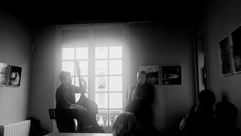 Cette matière humaine, brute et sincère, a trouvé un écho bouleversant dans les notes feutrées du saxophone d’Alex Golino, musicien italo-grec installé depuis longtemps à Bordeaux, et dans les lignes graves de Chuchi Garcia, contrebassiste et enseignant au Conservatoire de Bordeaux. Ensemble, ils ont proposé un concert intimiste et vibrant, entre jazz traditionnel et reprises des standards comme une bande-son improvisée à la série photographique exposée.