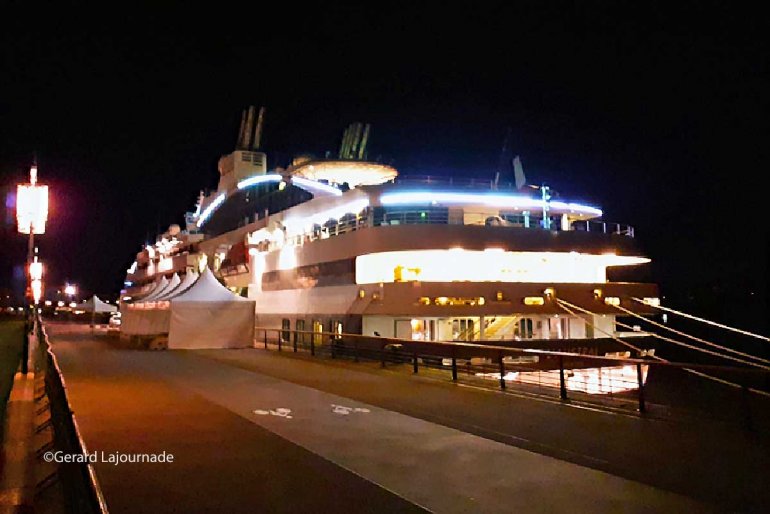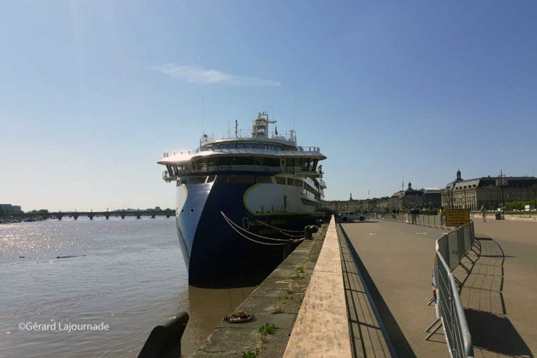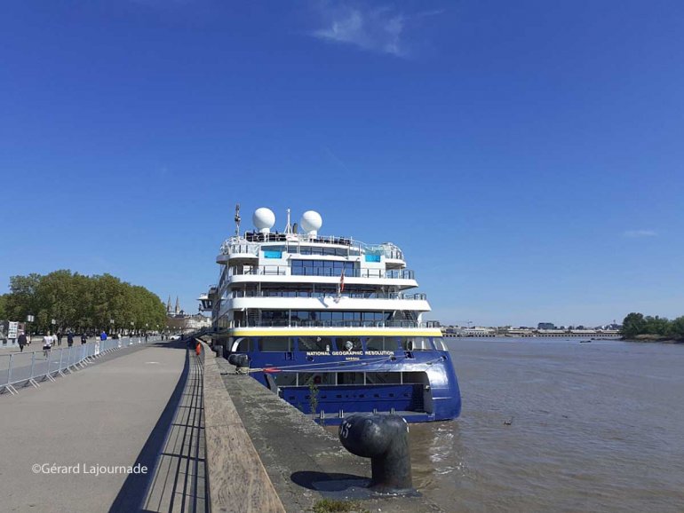Il est resté quelques temps accroché au quai du port de la Lune car en fait il accueillait les passagers des sa future croisière marquant ainsi le début du retour des croisières. Le National Geographic Résolution est un navire d’expédition d’une soixantaine de cabines. Bordeaux était le point de départ de cette croisière démarrée le lundi 17 avril avant de rejoindre d’abord La Palice puis Brest et Saint Malo en suivant où il se trouve actuellement avec à bord, 103 passagers et 106 membres d’équipage. La particularité de ce paquebot long de 124,40 mètres est d’être doté d’une étrave inversée qui lui donne son aspect particulier. Il se dirige vers l’Irlande pour cette croisière qui a marqué le lancement de la saison des croisières car l’Austral et venu lui succéder rapidement sans pour autant s’éterniser