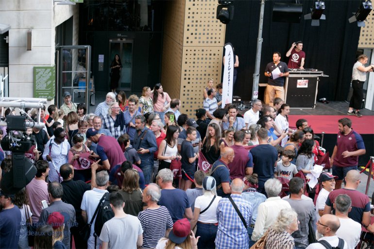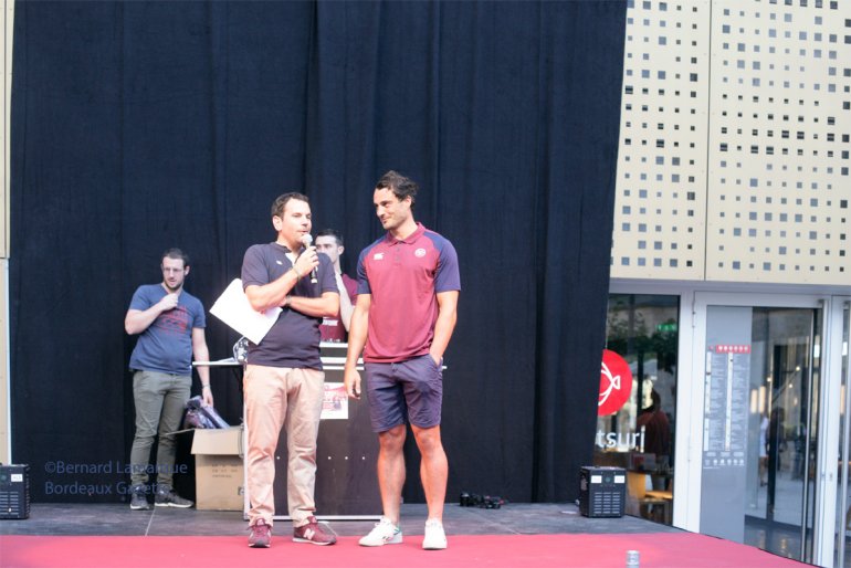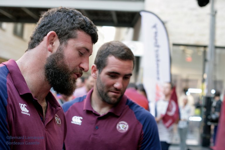 Ne serait-ce que pour mieux ancrer l’image de l’UBB dans le centre de la ville car Urios a fait le pari de non seulement réconcilier Bordeaux et son équipe de rugby que Teague avait isolé de ses supporters mais de créer un courant fusionnel, cette manifestation promenade Saint Catherine a raisonné comme une suite festive à la rencontre gagnée contre le Stade Français. Pas mal de jeunes et quelques moins jeunes s’étaient précipités pour approcher leurs joueurs favoris avec un Connor très sollicité comme d’habitude, c’est un peu la coqueluche de ses demoiselles, un Nans Ducuing très volubile et souriant, un Rémy Lamerat signant ballon et drapeau ainsi que Maynadier et Luc et tous les autres très sollicités. Ils étaient là et bien la tous pour le bonheur de ceux qui voulaient les approcher et réaliser quelques selfies avec leur joueur préféré. Jean-Baptiste Poux était présent ainsi qu’Heini Adams qui reste un des anciens joueurs les plus aimé du public tant il a apporté à l’UBB étant le demi de mêlée de la montée en Top 14, il est devenu plus bordelais que bordelais.