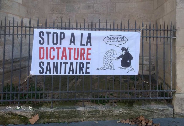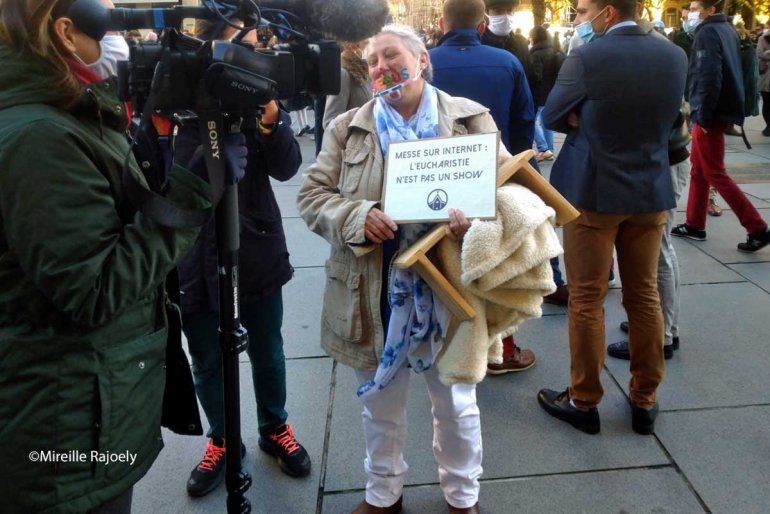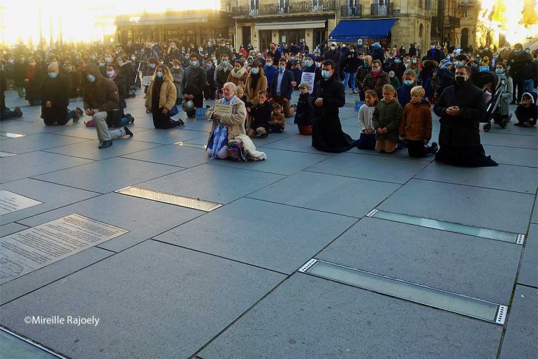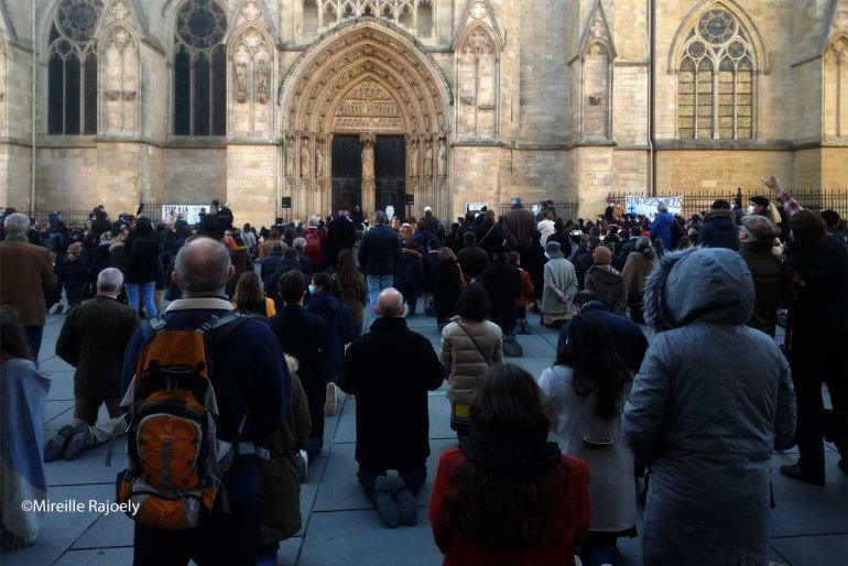 Deuxième dimanche de rassemblement devant la cathédrale Saint André côté Nord et on s’en est bien aperçu car il fallait être bien couvert pour suivre cette manifestation en plein air demandant le retour de la messe à moins qu’on ne veuille l’appeler cérémonie car le propos introductif a été court tout en rappelant ques organisateurs avaient encore reçu des menaces de la part des pouvoirs préfectoraux. Néanmoins pas la moindre présence policière aux abords du rassemblement comme la semaine passée, même si quelques motos sont passées avec leur pilote jetant un regard dédaigneux aux présents sur cette place Pey-Berland qui étaient moins nombreux que la semaine passée. Pas de risque de Covid avec les distances demandées entre chaque participant à qui on a demandé de se tenir a bras tendu les uns des autres, par contre vu le froid risque de gros rhume si l’on était pas suffisamment couvert pour suivre ce moment de prière car à l’ombre de la cathédrale, le temps était plutôt réfrigérant. On a vu tout de même apparaitre quelques pancartes plus vindicative comme cette "Stop à la dictature sanitaire", car même si les français sont conscient du problème, ils en ont un peu plein le dos des multiples interdictions et de se promener la feuille à la main pour se justifier de ce qu’il font et où ils vont d’autant que pour certains c’est vraiment sur du papier et non sur un portable. Noêl approche et un noël sans messe de minuit serait une catastrophe car c’est une fête qui quel que soit sa religion est souligné aux quatre coins de la planète si l’on peut s’exprimer ainsi pour une terre qui est ronde.