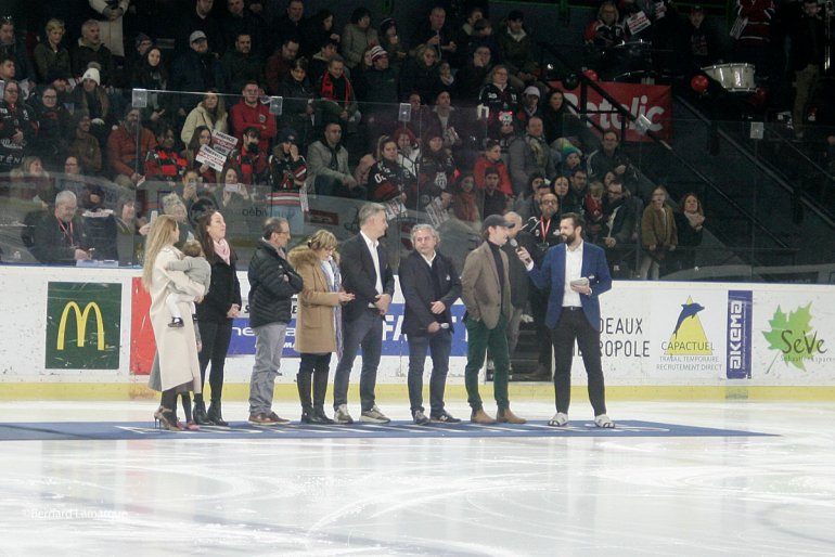 C’est une patinoire pleine qui a assisté a l’accrochage du numéro 55 en haut de la patinoire à coté de celui de Stéphane Tartari. L’accrochage d’un maillot consiste à mettre de côté le numéro porté par un joueur après sa retraite(voire son décès) en hommage à sa contribution au club. Ce numéro ne sera plus jamais porté par aucun joueur dans le club, ce numéro c’est celui de François Paquin qui a consacré 12 ans de sa vie aux Boxers et qui continue en étant entraineur des U20, U17 et U13, c’est aujourd’hui le plus bordelais des Québécois. Sous l’impulsion de Stéphane Tartari le club grandi et se structure avec maintenant l’appoint de François Paquin qui a fait souche à Bordeaux son titre de gloire, le plus marquant reste de celui de capitaine de l’équipe qui a accédé à la Lige Magnus et qui depuis n’a jamais quitté le haut niveau. François Paquin a raccroché les patins en championnat à la fin de la saison passée mais de part son activité, il reste très présent au club. Vous trouverez sous la plume de Claude Canellas un très intéressant portrait de François Paquin ICI