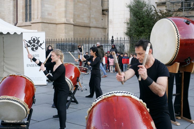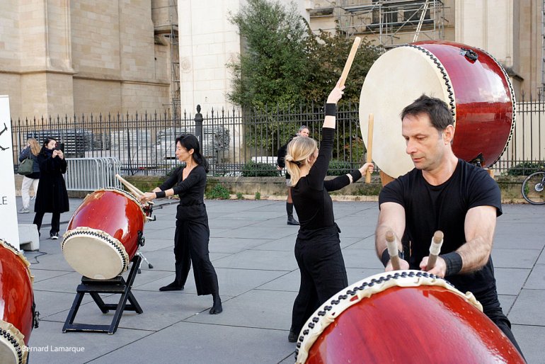 C’est au son des tambours (teiko) que le village s’est ouvert. Les grands tambours japonais sont les compagnons naturels et ancestraux des arts martiaux du pays du soleil levant. C’est une petite formation du Paris Teiko Ensemble de trois personnes qui est venu donner un concert de teiko pour l’ouverture de ce village japonais qui marque les quarante ans du jumelage de Bordeaux avec Fukuoka dont une délégation conduite par son maire est actuellement en visite dans la cité bordelaise.