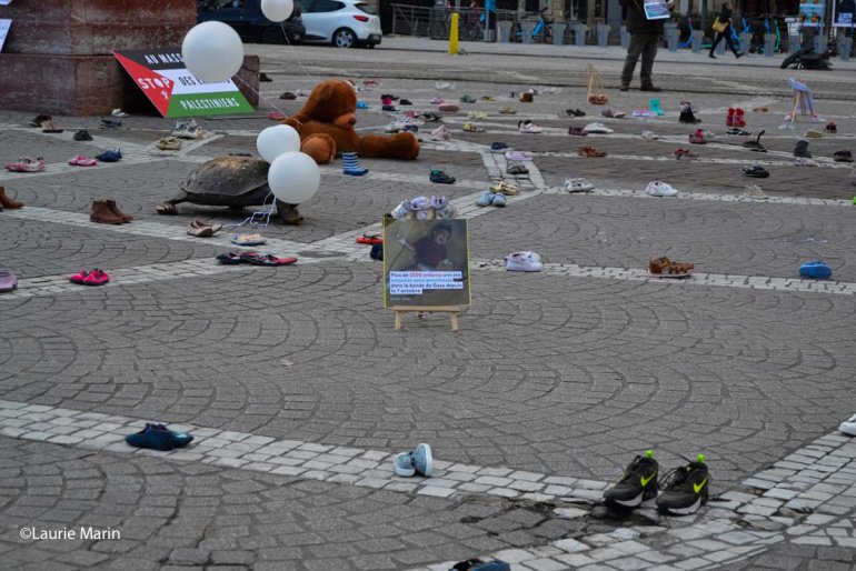 Des dizaines de chaussures d’enfants ont été réparties sur la place de la Victoire par le comité action Palestine, pour rendre hommage aux enfants tués depuis le 7 octobre.
