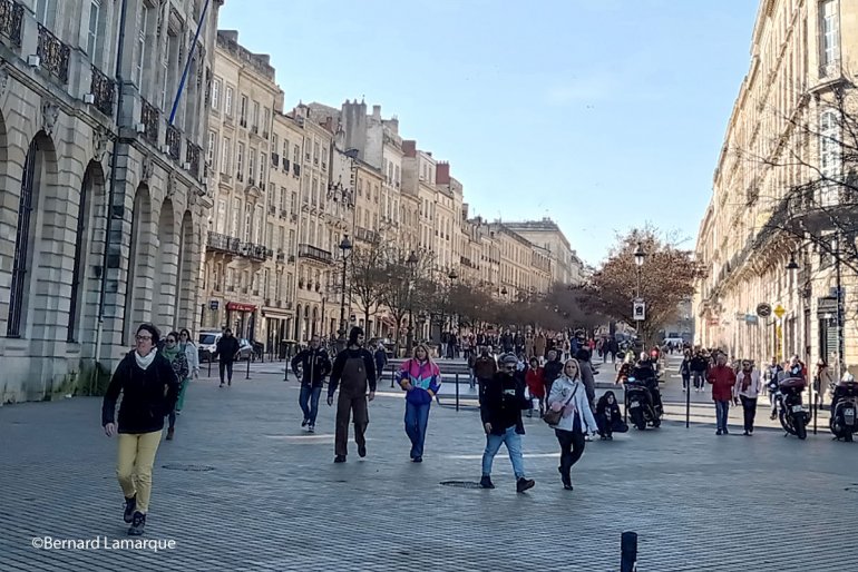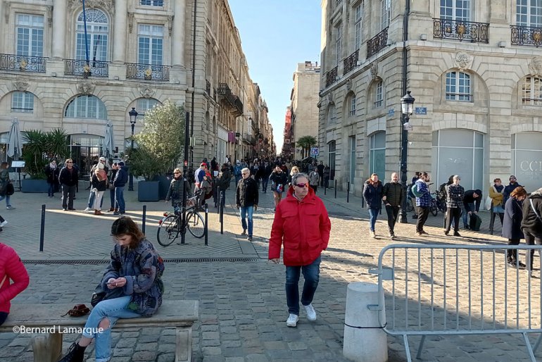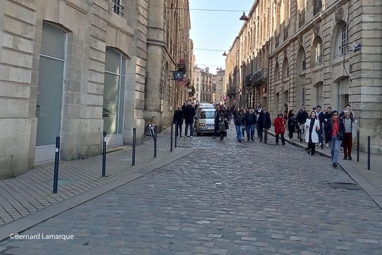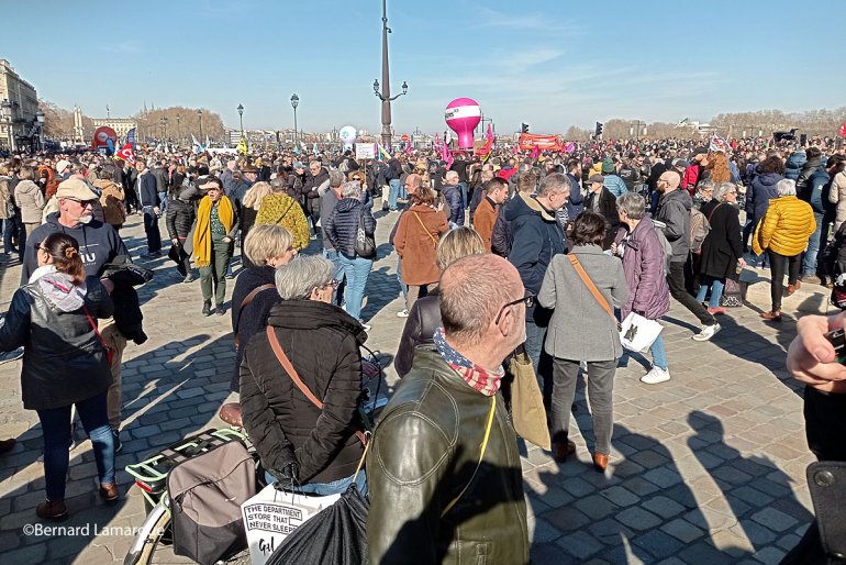- La banderole de la tête du cortège est toujours la même mais le lieu de départ est symbolique après la place de la République et la place des Quinconces, c’est la place de la Bourse.