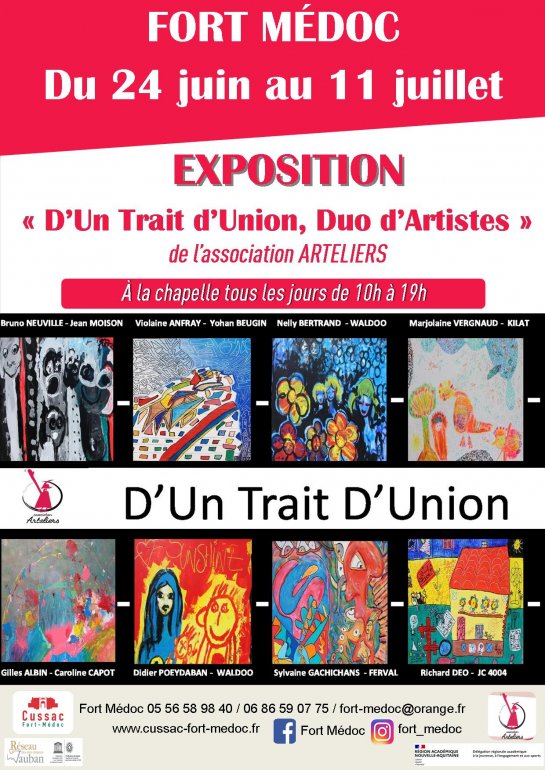 L’association des Arteliers vous invite à une exposition d’arts plastiques, peinture, art textile, totems, décors autour de "Duos d’artistes" et de traits d’union qui relient, des créateurs et créatrices dont les points communs tiennent dans leurs talents multiples, et leurs différences dans (ce n’est pas un pléonasme) La Différence qui a mis certains d’entre eux devant des difficultés et des besoins spécifiques...Et d’autres qui sont déjà reconnus comme des "professionnels de la profession", comme disait Godard... Tous ces gens se sont retrouvés dans le dialogue et l’élaboration en commun de l’œuvre. (Devant l’œuvre, il n’est pas de "handicap" qui tienne !) .... L’exposition dure un mois dans la superbe chapelle du fort Médoc. Du 24 juin au 11 juillet.
