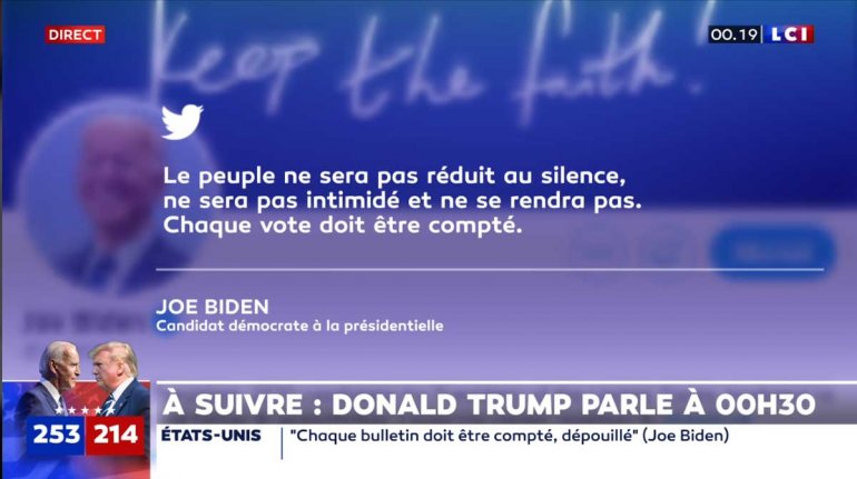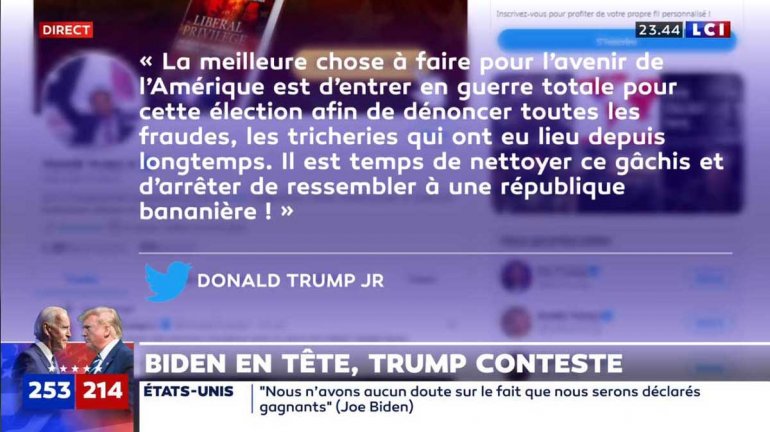 Dans le cadre du dépouillement des votes aux USA, un tweet du fils de Donald Trump jette l’effroi avec des mots très fort et très inquiétant alors que Donald Trump est muet depuis 37 heures. Ce tweet a été immédiatement supprimé à la publication et l’on attend une prise de parole de Donald Trump à minuit trente. Il faut remarquer l’emploi du vocabulaire qui pourrait s’apparenter à un coup d’Etat car la violence est surprenante et il appelle à l’emploi des armes et on sait que les américains se sont beaucoup armés ces derniers temps.