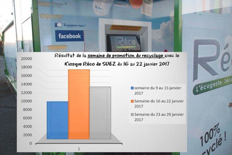 En janvier avec le Super U d’Eysines, nous avions initié la semaine de la promotion du recyclage avec les kiosques Réco de Suez. Opération de promotion, la valeur des bons d’achats était doublée durant cette semaine de collecte.
