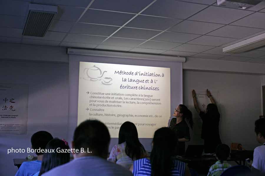 Si les achats de château du vin par des Chinois fait la une des journaux, les relations entre la capitale aquitaine et la Chine sont loin de se limiter à ce seul aspect. Ainsi l’an dernier ont été créés des cours gratuits de chinois, donnés à l’Athénée et lancés lors d’une manifestation au Musée d’Aquitaine. Comme dans une petite école communale à la campagne, tous les âges et les niveaux sont mélangés, créant une atmosphère sympathique. D’abord réservés au seuls enfants de la communauté chinoise bordelaise, ces cours vont s’ouvrir à tous les jeunes (et moins jeunes) quelque soit leur origine.