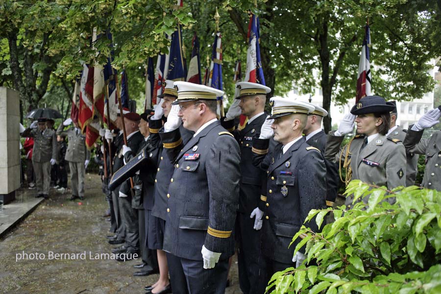 C’est sous une pluie battante qu’a eu lieu cette commémoration et si les parapluies étaient de sortie, on n’a pu qu’admirer le stoïcisme des militaires présents qui ont affronté sans sourciller les frimas de cette matinée. Les enfants des écoles présents ont entonné la Marseillaise avec courage alors que les paroles étaient couvertes par le bruit de la pluie tombant sur le sol et les feuillages. Beaucoup de dignité malgré un temps épouvantable.
