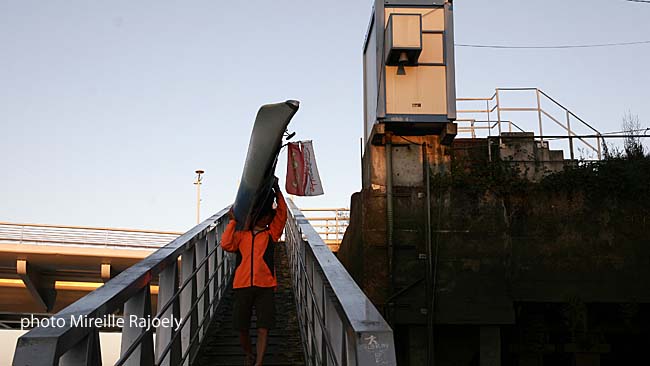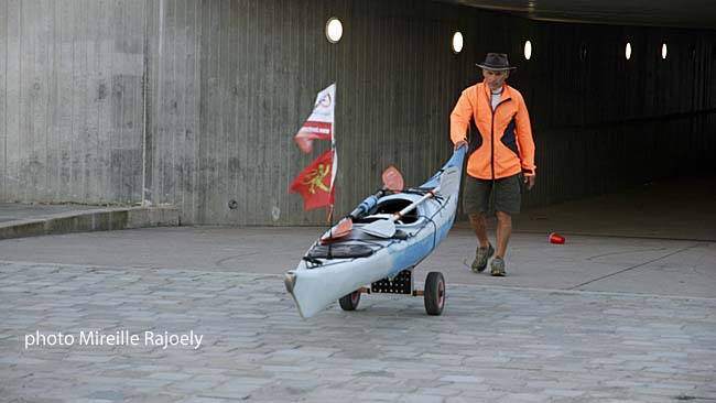 Levé de très bon matin notre randonneur kayakiste doit se transporter jusqu’au ponton du port autonome pour mettre son embarcation à l’eau après avoir fait une dernière "check-list". Il se rend donc, à pied de son habitation au point d’embarquement en poussant son kayak qui est placé sur un berceau muni de roues qui lui permet de couvrir de longues distances sans se fatiguer comme pour la traversée de Toulouse qu’il est obligé d’effectuer à pied ce qui lui mérite d’autant le titre de randonneur.