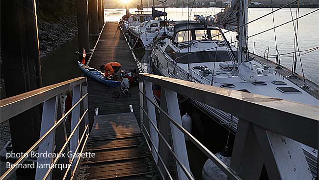 C’est à 7 heures 02 alors que la renverse n’était pas effectuée qu’il a quitté le ponton du port autonome en passant sous le pont Bacalan Bastide pour entamer son sixième périple vers la Méditerranée. Face au courant il a mis trente minutes pour franchir les trois premiers kilomètres jusqu’au Pont de pierre mais une fois la renverse effectuait il a avalé les kilomètres pour se retrouver après 5 h 53 minutes à Castets en Dorthe ou il s’est arrété pour se restaurer avant de rejoindre le Canal des Deux Mers, noyau dur de son périple.