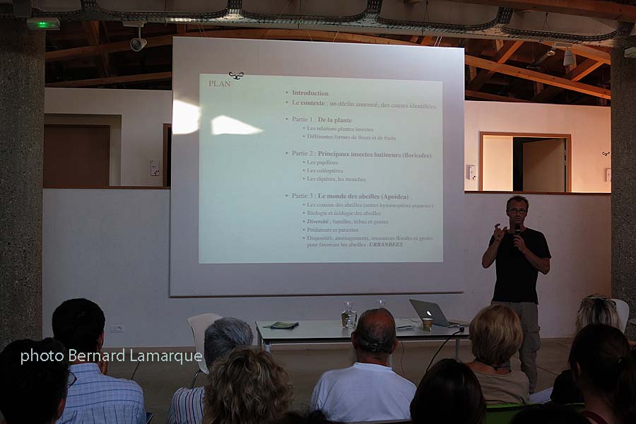 Le cycle proposé autour de l’abeille par la maison écocitoyenne était bâtit sur 3 conférences, la première sur le thème de l’abeille et la santé, la deuxième sur le thème de l’abeille et ses prédateurs, la troisième concernant le monde méconnu des abeilles sauvages. On assiste a un phénomène inquiétant qui est celui de la disparition de nombreux insectes pollinisateurs, tout au moins à leur déclin. Plus de 80% des espèces de plantes à fleurs sauvages et 70% des espèces cultivées en Europe dépendent de l’activité pollinisatrice des insectes et principalement des abeilles. Si le déclin qui menace les abeilles est préoccupants pour les écosystèmes naturels, il l’est aussi pour les productions agricoles et, par voie de conséquence, pour notre alimentation dont 1/3 serait directement affecté. Les causes de ce déclin sont multiples : disparitions des sites de nidification (remembremennt, urbaisation), emploi généralisé de pesticides, fauche de plus en plus précoce et fréquente des prairies, extensions des monocultures et entretien exagéré des talus et des bords de route.