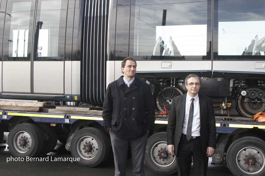 Il faut souligner les efforts réalisés par Alstom pour cette commande qui a réussi à produire une rame à 3 millions d’euros ce qui représente un gain de 900.000 euros en euros constant d’autant qu’Alstom maîtrise parfaitement la technologie APS ce qui n’était pas certain avec son concurrent espagnol et ce tramway reste une formidable vitrine pour la technologie française. Ainsi les deux parties de la rame sont transportés par route pendant la nuit et son déchargés le lendemain à Bordeaux dans la journée car l’opération est délicate. Il faut aligner les roues de manière très précises pour qu’elles puissent s’engager sur la voie et l’ordre de déchargement doit être scrupuleusement respecté. La rame est ensuite assemblée mais elle devra subir des essais même si elle a déjà parcourue plus de 1.000 kilomètres sur voies balastées. Des essais de traction et de freinage sont du reste prévus sur la partie avenue Thiers de la ligne A en mai. Les rames seront progressivement mise en route sur le réseau à partir du mois de septembre. Vincent Feltesse a signalé que les travaux vont bon train surles extensions de la ligne C avec des rails qui commencent à être soudés du côté du Palais des Congrès et des soudures qui vont commencer du côté de Bègles ou la mise en service des extensions est prévue pour 2015.