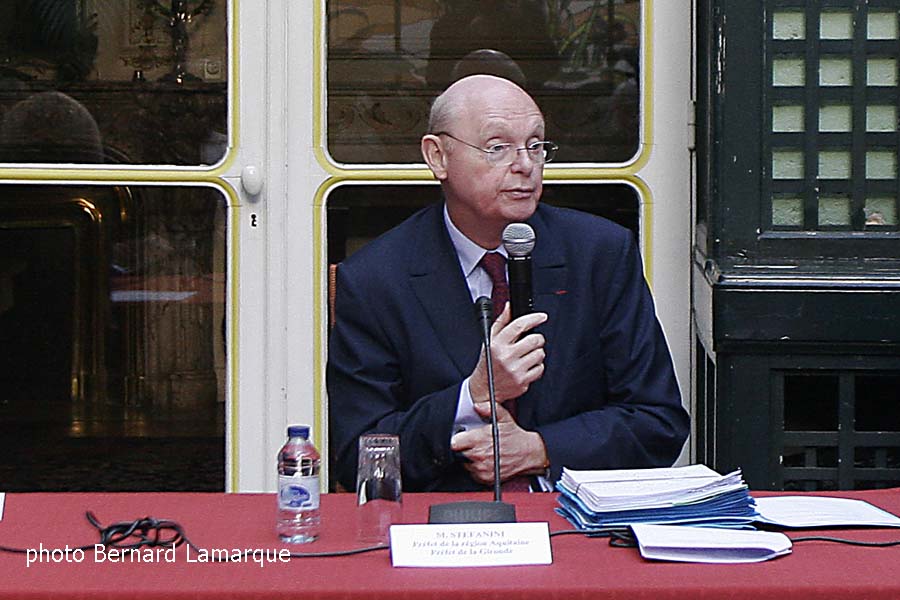 En matière d’infrastructure car l’aménagement du territoire est un volet important avec les conventions d’amélioration des itinéraires routiers (mise à 2 fois 3 voies de la rocade) et surtout le gros dossier de la LGV, dont le début des travaux est prévu en mars car les bases de travaux sont installées même s’il reste un petit problème sur Ambares. En ce qui concerne le GPSO, une proposition de tracé s’est dégagée depuis le 9 janvier et il s’agit de la proposer au ministre dans le courant janvier-février afin de pouvoir lancer l’enquête publique en 2013. Pour l’instant la section internationale du tracé (financement exclusif état-europe) n’est pas déterminée même si l’on sait que ce sera entre Dax et Vitoria et que les discussions se feront entre Etat Français et Etat Espagnol. En annexe du GPSO, la liaison Béarn-Bigorre (Pau, Tarbes, Lourdes) et la commission national du débat public sera saisie. Ainsi, le préfet insiste sur les infrastructures et précise :"Dans une économie libérale, la première responsabilité de l’état c’est quand même de fournir aux acteurs économiques des infrastructures performantes, notamment en matière de transport". L’aéroport de Bordeaux se porte très bien et peut être qu’on reparlera de l’ouverture du capital en 2012 ; il faudrait qu’une décision soit prise rapidement pour la jonction ville de bordeaux-aéroport. Compte tenu de la vitesse d’expansion de la région, celle-ci risque d’être confronter à une pénurie de matériaux car pour construire des routes et des logements, il faut du béton et pour faire du béton, il faut des graviers, des roches et il faudra en importer si on en a plus sur place. Mise en place du schéma régional climat-énergie avec les scénarios Grenelle (- 20% d’émission de gaz à effet de serres) et Durban (- 33%), du schéma régional de cohérence économique et la directive d’aménagement et de développement durable qui s’intéresse à l’avenir du littoral et de la forêt. La protection des populations au titre des risques naturels majeurs que sont inondations et feux de forêts préoccupe les pouvoirs publics. Ainsi, en ce qui concerne les inondations, l’achèvement du recensement des ouvrages de protection afin de les mettre aux normes et d’élaborer un nouveau schéma de protection des populations est en cours. Autre sujets le financement des investissements des collectivités territoriales par la Caisse des Dépôts et la Banque Postale et les fusions.