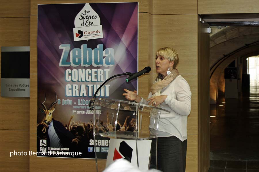 Pour sa part le Libournais va recevoir le groupe ZEBDA pour l’inauguration officielle qui habituellement se fait en Mai et Arthur H dans le cadre de Musik à Pile, ainsi un mois avant que la grande scène Saint Jean d’Acre des Francofolies ne les accueille, ils seront en Gironde. Démarrage musical de ces Scènes d’Été 2012 très pointu, mais comme d’habitude la programmation globale de ces 4 mois de Scènes d’Été est très relevé avec les temps très forts que sont les 24 heures du Swing de Monségur, Jalles House Rock à Saint Médard en Jalles en regrettant un télescopage de date, mais montrant bien en cela que la Gironde se transforme en une très vastes scène culturelle pendant ces mois d’Été avec 1.000 spectacles dont 500 gratuits. Avec La Bataille de Castillon, Fest’Arts, Reggae Sun Ska, les Chantiers de Blaye et bien d’autres le choix est considérable. Après le discours d’introduction de Philippe Madrelle dans le décor très convivial des Archives Départementales, c’est Isabelle Dexpert, Vice-Présidente chargée de la Culture, sport, vie associative qui a présenté cette saison des Scènes d’Été 2012. En bonne gestionnaire elle a insisté sur la différence qu’il faut faire entre " spectacle gratuit " et " accès libre " car les 500 spectacles ne sont pas gratuit car il y a une structure qui paye souvent en partenariat avec le soutien technique et matériel de l’IDDAC, ainsi donc elle préfère la notion d’accès libre a celle de spectacle gratuit car il n’y a aucune répercussion du prix du spectacle sur un billet d’entrée qui du reste n’est pas délivré. En tout état de cause quand les spectacles sont délivrés à titre onéreux, cela n’a rien à voir avec les tarifs affichés dans les circuits commerciaux traditionnels.