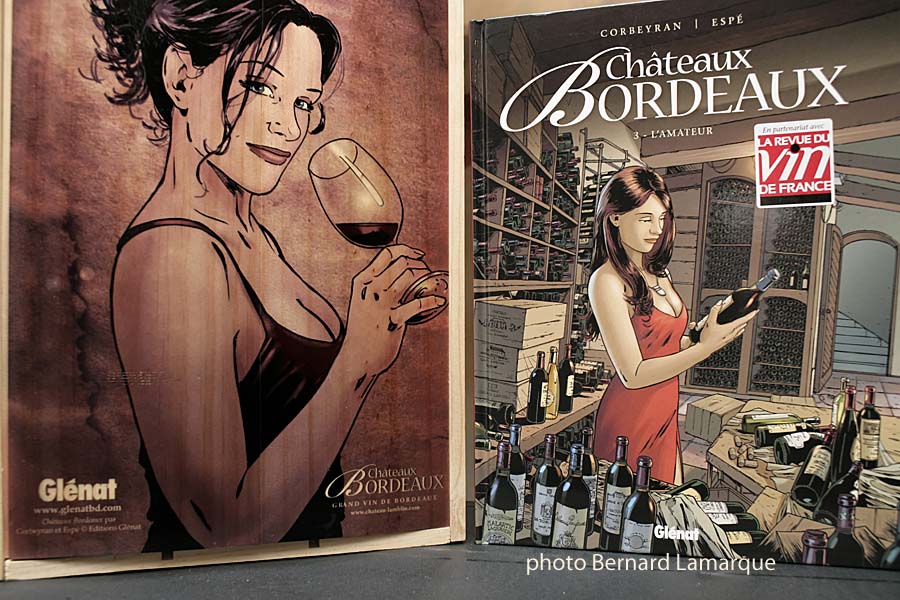 Parallèlement le caricaturiste évoluant dans sa pratique en passant aux caricatures faites à base de vin, les originaux des monuments bordelais illustrant les coffrets ont été réalisé à l’aide du vin du château Lamblin permettant d’effectuer la sérigraphie sur les coffrets. C’est ainsi qu’il a développé cette activité de coffrets cadeaux qu’il décline sous différentes formes pouvant aller jusqu’à 3 flacons par coffret et ces coffrets rencontrent un grand succès auprès du public. Pour sa part Mika continue allègrement à croquer son monde et quelques grands de ce monde avec ou sans vin à travers différentes animations et il rentre d’un séjour de 50 jours passés à bord d’un navire de croisière entre Suède et Finlande. Nouvelle étape pour Francis Lamblin avec la rencontre d’Eric Corbeyran lors de la présentation des Itinéraires de Charlotte en 2012. Celui-ci travaille à la demande de sa maison d’édition sur une nouvelle série intitulée "Châteaux Bordeaux" qui est une saga de plusieurs albums dont le héros est en fait une héroïne qui affronte tous les vicissitudes et les métiers liés au vin dans le cadre d’une propriété en Médoc et dont le tome 3 vient de sortir (mars 2013). Francis a proposé à Glénat et au dessinateur Espé de réaliser des coffrets avec des images de la bande dessinée, ce qu’il a obtenu et les 3 premiers modèles ont été présentés au Salon de la BD d’Angoulême. Eric Corbeyran, scénariste de la BD "Châteaux Bordeaux" qui travaille déjà sur les tomes suivants garçon affable et généreux n’hésite jamais à se déplacer pour dédicacer ses histoires que son compère met en images et on n’a pu que regretter qu’il ne fût point là.
