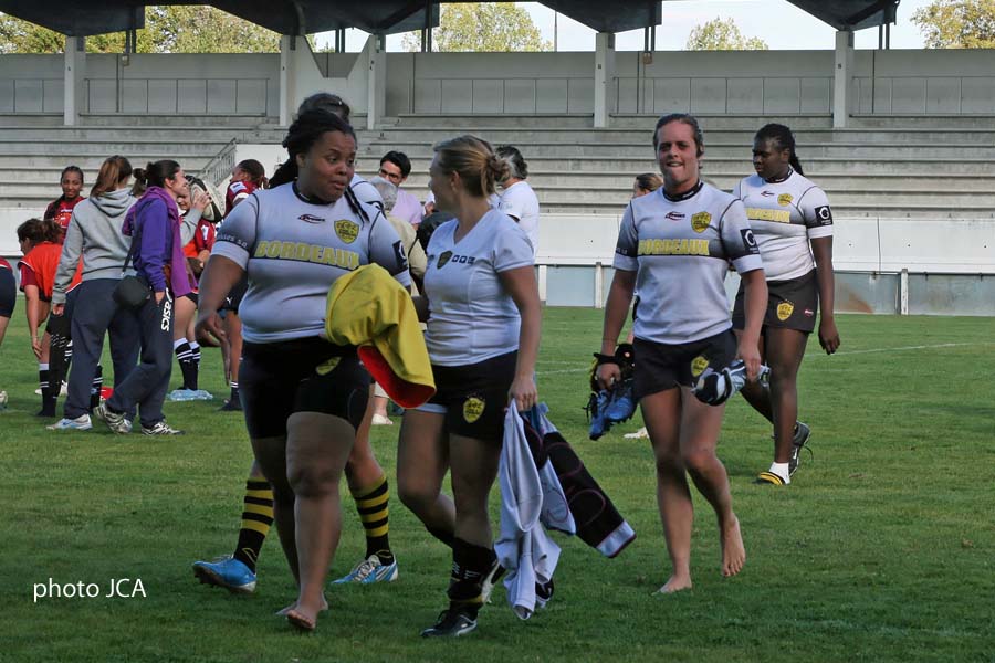L’expérimentée Christel LE DUFF, pensionnaire de l’équipe de France à 7, après un premier échec transforme en point la domination territoriale des locales, cela fait six minutes que la partie a commencé. Sur le coup d’envoi suivant et grâce à une défense aux abonnés absents les rouge et jaune inscrivent le premier essai d’une longue série. Les avants permettent à la capitaine de l’équipe de France Marie-Alice YAHE de dynamiser le jeu avec des trois quarts entreprenantes et pleines de vitesse qui donnent le tournis à leur homologues incapables sur le premier acte de stopper les initiatives USAPISTES. Les partenaires de Fanny HORTA sont sur un petit nuage, tout leur réussit jusqu’aux rebonds habituellement capricieux du ballon. Elles inscrivent six essais et une pénalité en première période. 41 à 0 à la pause, la messe est dite et malgré une réaction d’orgueil des bordelaises, ces dernières encaissent trois nouveaux essais en deuxième mi-temps.