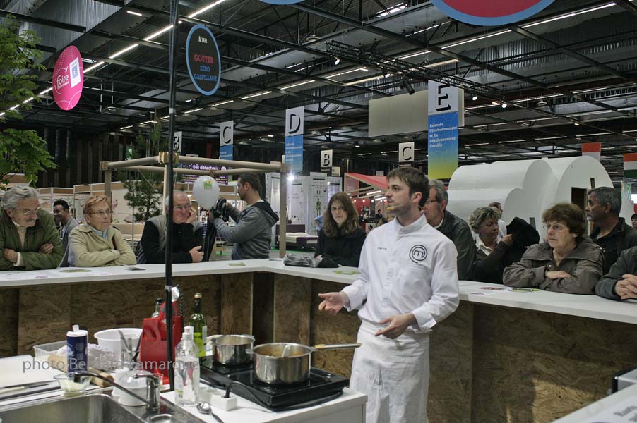 Comme il est musicien, il aurait pu être intermittent mais par goût et par passion il faisait de la cuisine et aujourd’hui c’est devenu un métier, dans le cadre de la Foire à sa manière il renoue avec l’enseignement. Quand on le voit, qu’on l’écoute et surtout qu’on le regarde on comprend que faire passer un message est chez lui une seconde nature avec une trajectoire inverse de Vincent Poussard qui est passé de la cuisine à l’enseignement, lui est passé de l’enseignement à la cuisine. Il a répondu aux questions des journalistes avec beaucoup d’humour, tout en effectuant sa recette de "Rizotto aux crevettes" dans laquelle il parfume son riz avec le jus obtenu avec les têtes de crevettes et des parties vertes de poireaux autrement dit, il montre comment on se sert de ce que l’on à tendance à mettre à la poubelle. Il n’est pas tendre avec les mauvaises habitudes qui nous font consommer des produits saisonniers toute l’année. Cette maladie qui à un coût élevée est transmise par le prédateur grande surface, moteur du gaspillage organisé qui pousse les gens à remplir le"frigo" quand il est déjà plein. Pour lui on a perdu le sens de ce qui est bon, il entend par là que la nourriture c’est aussi un symbole et que manger des oranges à Noël cela avait un sens, cela marquait un temps de fête et aujourd’hui en mangeant des oranges toute l’année on a perdu la notion de plaisir.