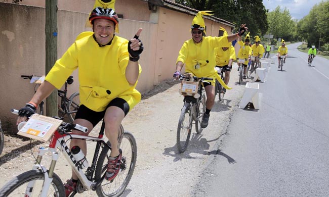 6500 randonneurs déguises ont parcouru les chemins et routes du Médoc, ce samedi 23 mai pour la Medocaine, la plus grande randonnée VTT française sur un jour ! Sur les 7 circuits de 20 a 80km de l’épreuve girondine, ils ont pédalé, chanté et dégusté dans les propriétés de cinq appellations viticole de renom, Margaux, Moulis, Listrac, Haut-Medoc et Bordeaux.