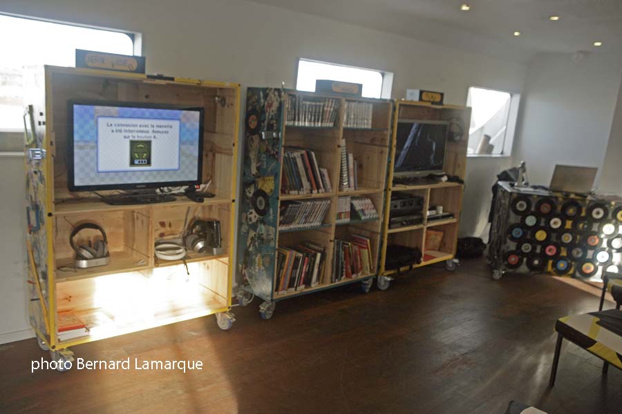 mobilier "street art" à roulettes, poufs, poires, banquettes, à l’intérieur et en plein air sur le pont, pour l’ambiance, jeux vidéo, films, musique, magazines, bandes dessinées et mangas, romans, pour le contenu.