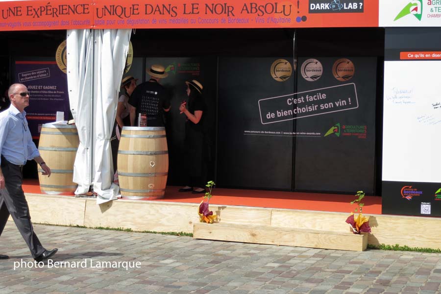 C’est dans le cadre du Concours des vins d’Aquitaine que l’idée a germé de faire une vraie dégustation à l’aveugle, c’est à dire dans le noir total. C’est surprenant, vous êtes dans la file vous vous tenez par l’épaule et vous rentrez en file indienne dans le monde des non voyants pour déguster des vins que vous ne voyez pas, mais que vous sentez et vous goûter. Très éloquent pour se rendre compte de ce que l’on perd et de ce que l’on gagne, c’est vraiment à essayer pour se faire des repères.